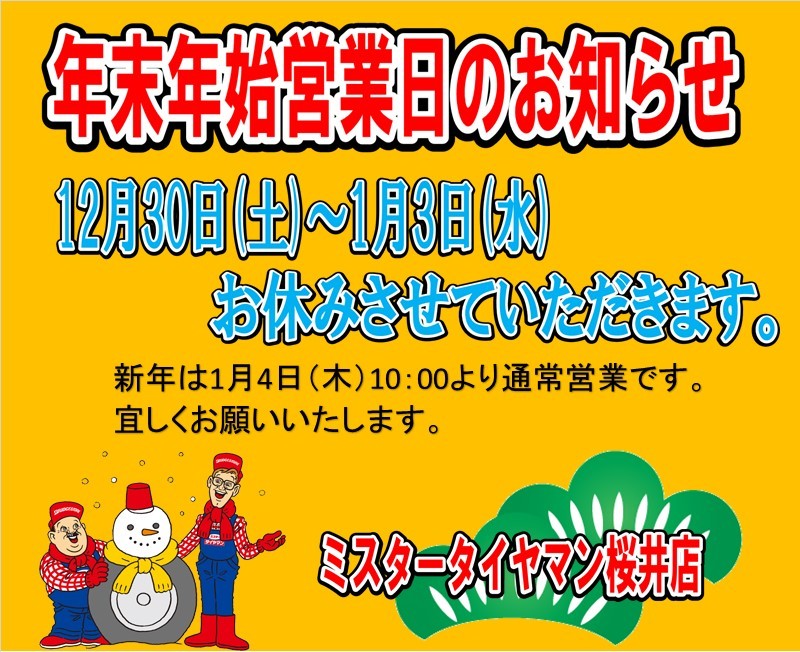 年末年始休業のお知らせ 2023年12月29日 2023年ミスタータイヤマン桜井店をご愛顧頂きありがとうございました。 誠に勝手ながら下記の期間、年末年始休業とさせていただきます。 2023年12月30日(土)~2024年1月3日(水) 新年は2024年1月4日(木)より営業営業いたします。 営業時間は10:00~18:15までとなります。 2024年もミスタータイヤマン桜井店を宜しくお願い申し上げます。