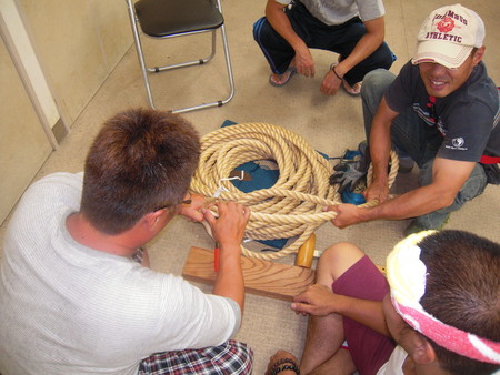 さつまを編んだり、つつみの縄を引張って伸ばしたりと、、、
