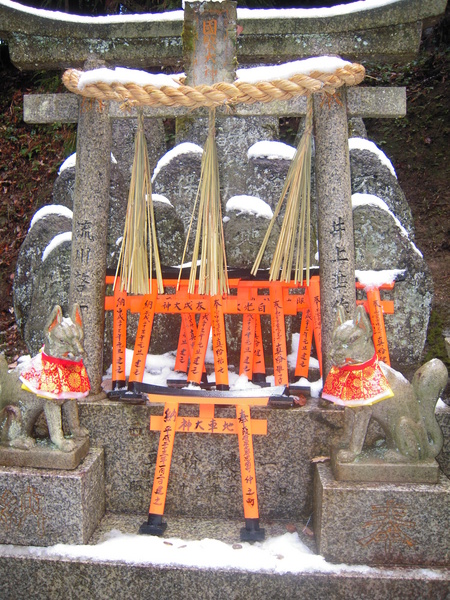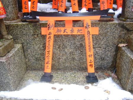 仲之町と書いていただいた鳥居を奉納して、お賽銭を雪の上において