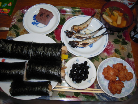 今晩は、巻き寿司2本と干瓢巻き・お吸いもの・いわし・海老のすり身の天ぷら・黒豆