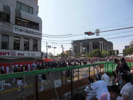 次から次へ太鼓・鉦・笛を賑々しくだんじりが地響きをたて勇壮豪快に角をヤッテいきます。