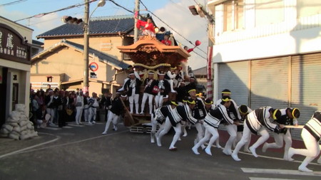 最後の力を振り絞って、青年團・少年團・子供たちが一生懸命綱を握ってだんじりを曳き廻しています。
