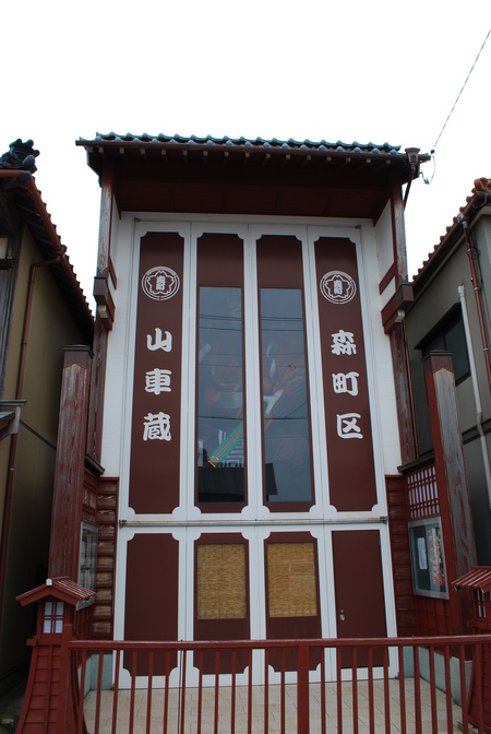 神社前の道沿いには、ガラス張りの山車蔵が2つあり