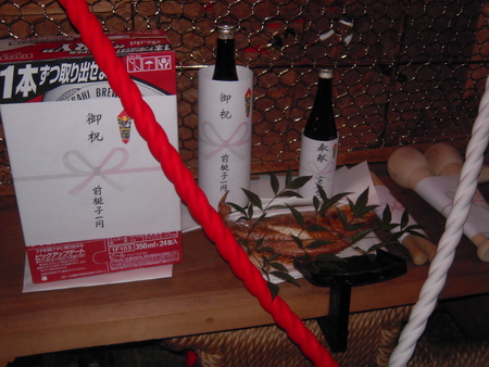 だんじりに、清酒・ビール・塩・鯛などをお供えして