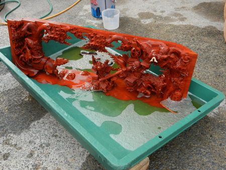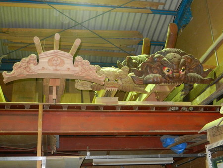 今、大修理されている岸和田市八木地区池尻町地車の彫物が洗われていました。そして、工務店さんの中に入ると、上だんじりや新調中の岸和田市上松町の地車が所狭しと置かれていました。