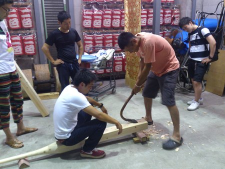 前梃子メンバーで本祭に使う前梃子にちょうなをかけて一本一本丁寧に仕上げていきます。