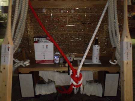 のし紙を巻いた一番梃子・お酒・ビールなどをだんじりの前に!