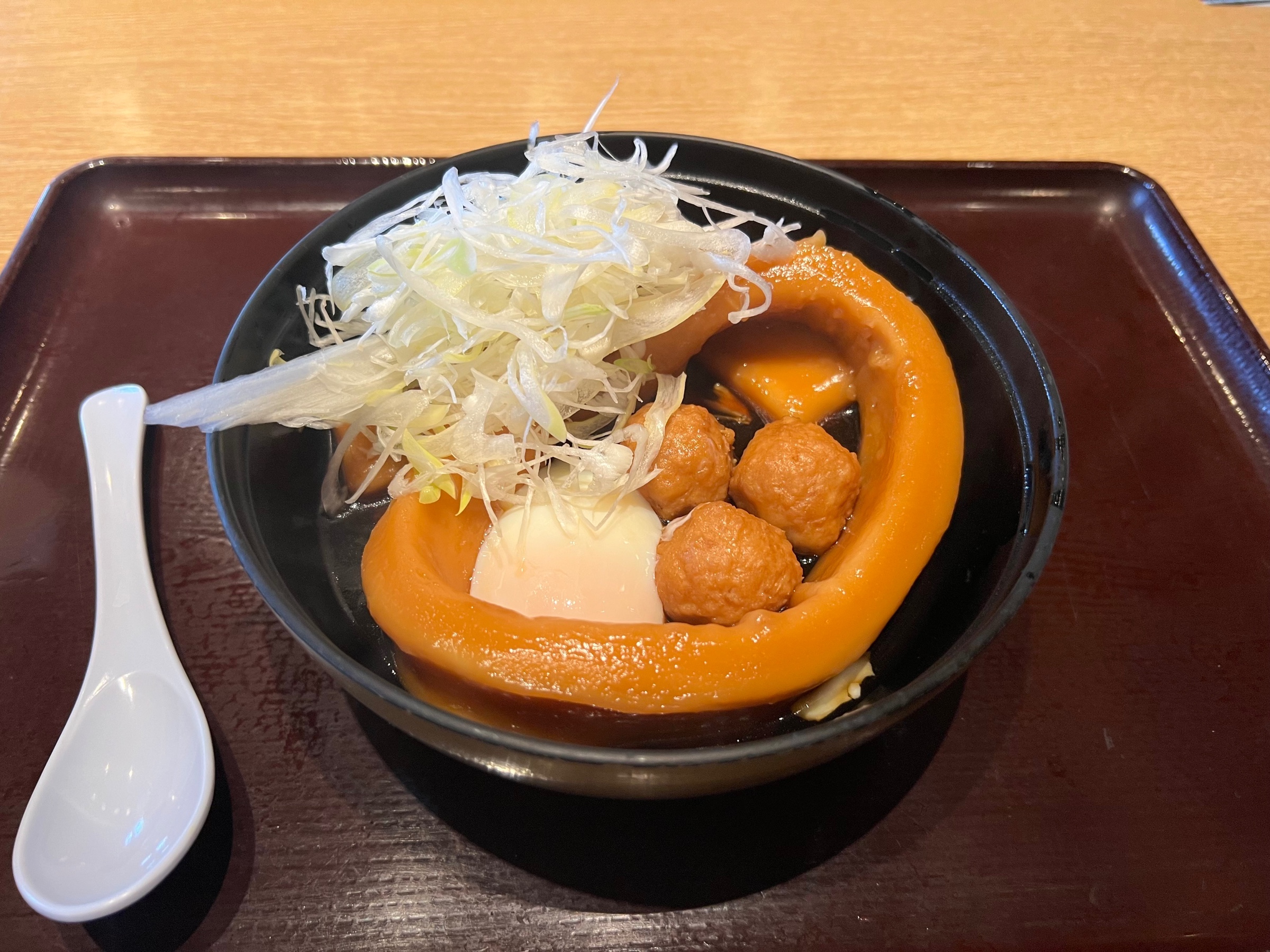看板メニューは「一本うどん」。その名の通り、太くて長いうどんが一本だけ器に入っており、インパクト抜群。