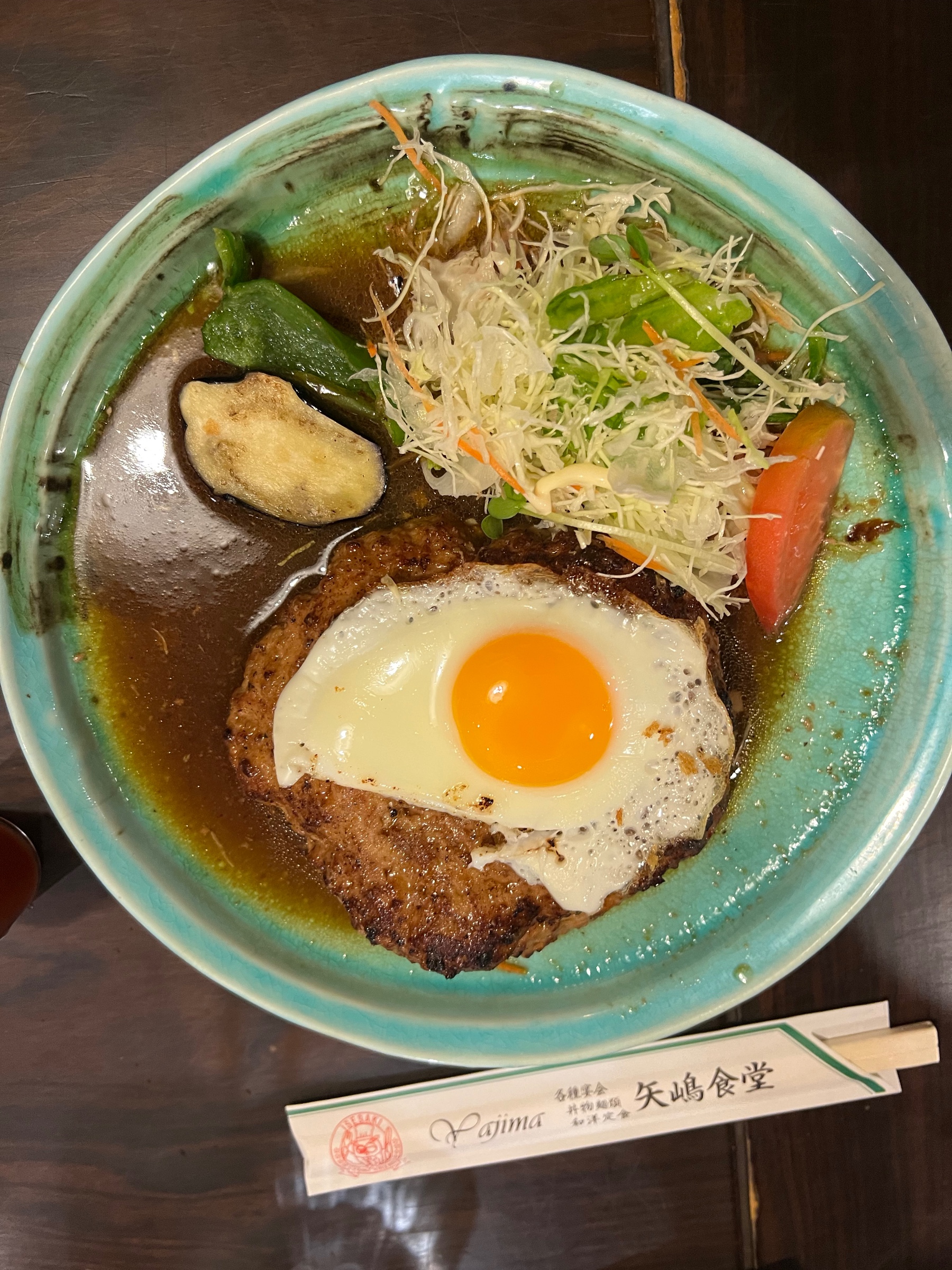 矢嶋ハンバーグは、ふっくらと焼き上げられたハンバーグに目玉焼きが乗ったボリューム満点の一皿。付け合わせの焼き野菜とサラダも彩り豊かで、見た目にも美味しい定食でした。