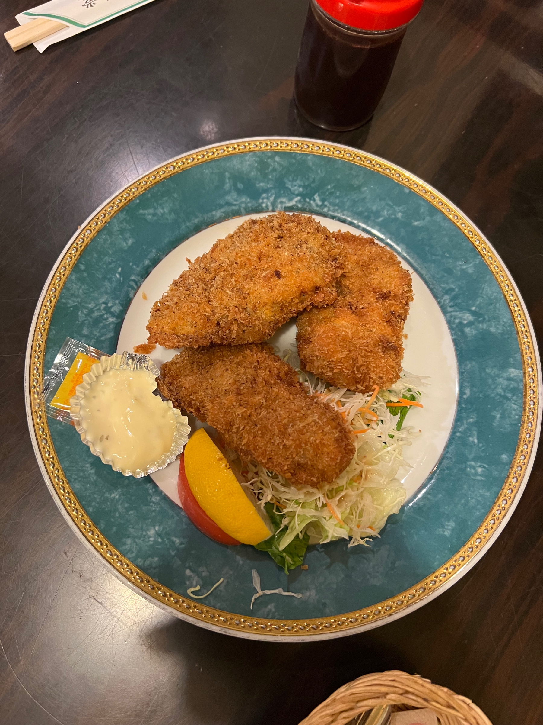 ヒレカツは、サクサクの衣に包まれた柔らかい豚ヒレ肉が絶品。添えられたキャベツとトマト、レモンでさっぱりといただけます。