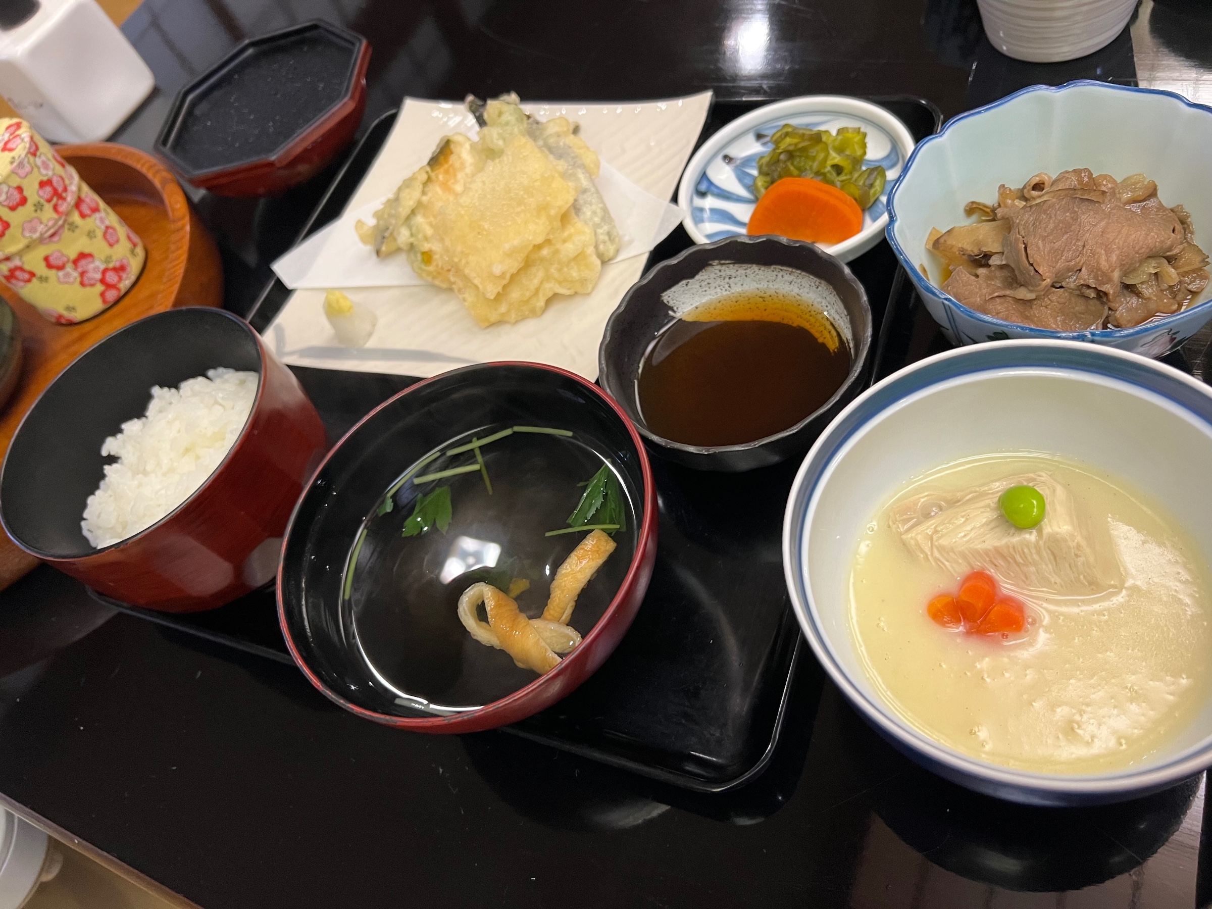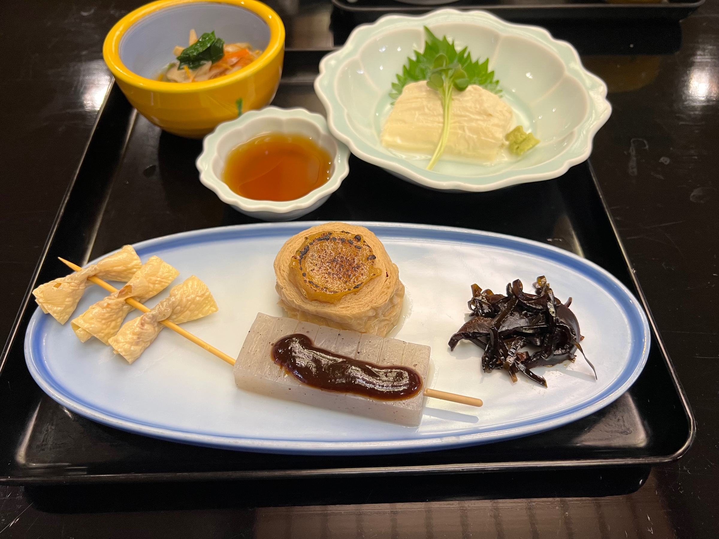 今回いただいたのは、湯葉の刺身、煮物、揚げ物、そして湯葉を使った創作料理が並ぶ豪華な御膳。湯葉のやさしい味わいと食感が存分に楽しめる内容で、ボリュームもたっぷり。最後にいただいた羊羹も上品な甘さで、食事の締めにぴったりでした。