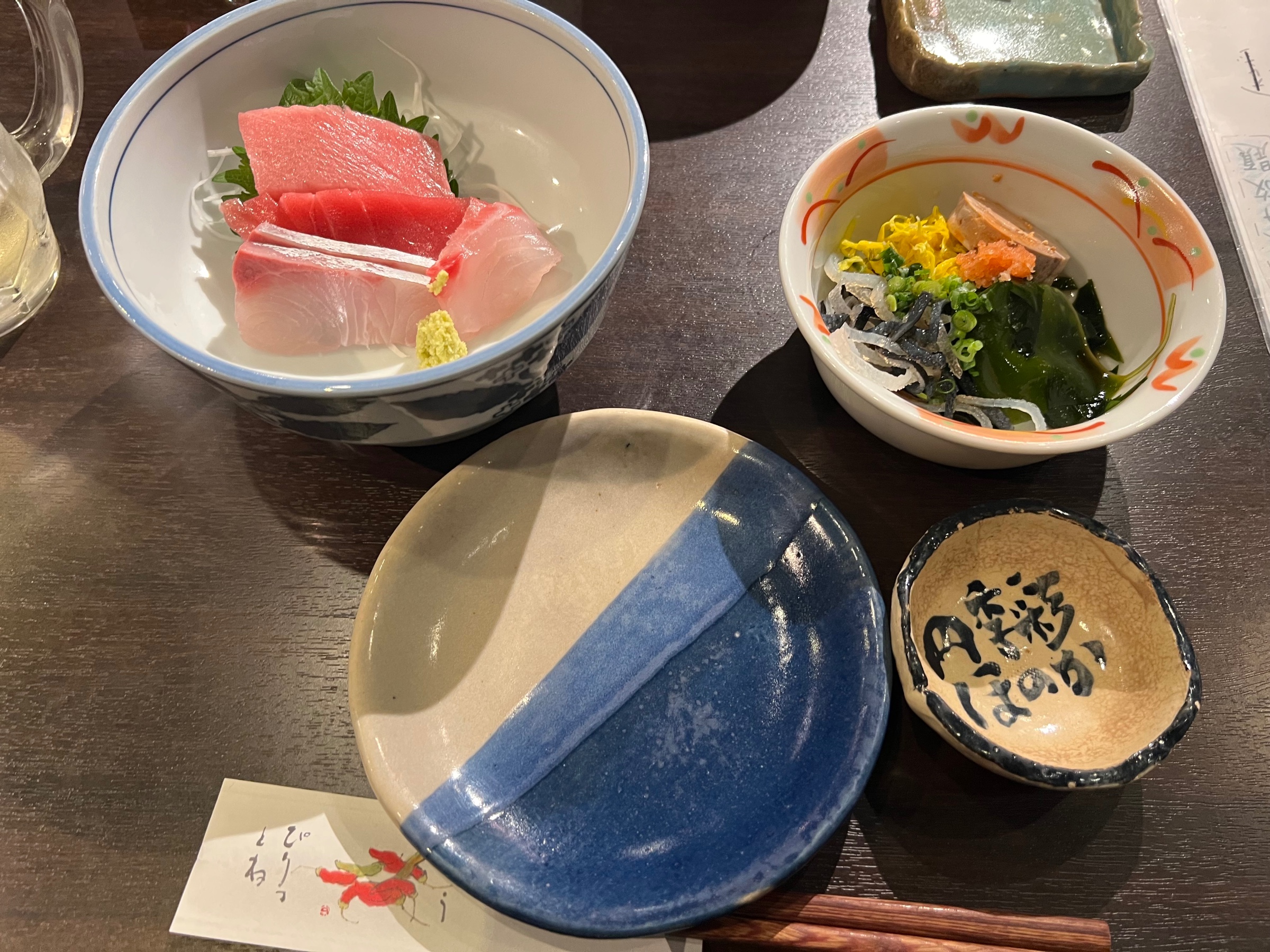 刺身はマグロと白身魚が美しく盛られ、わさびと大葉が香りを引き立てます。小鉢には、わかめや野菜、魚のほぐし身が添えられ、見た目にも華やかで、味わいも優しい一品でした。