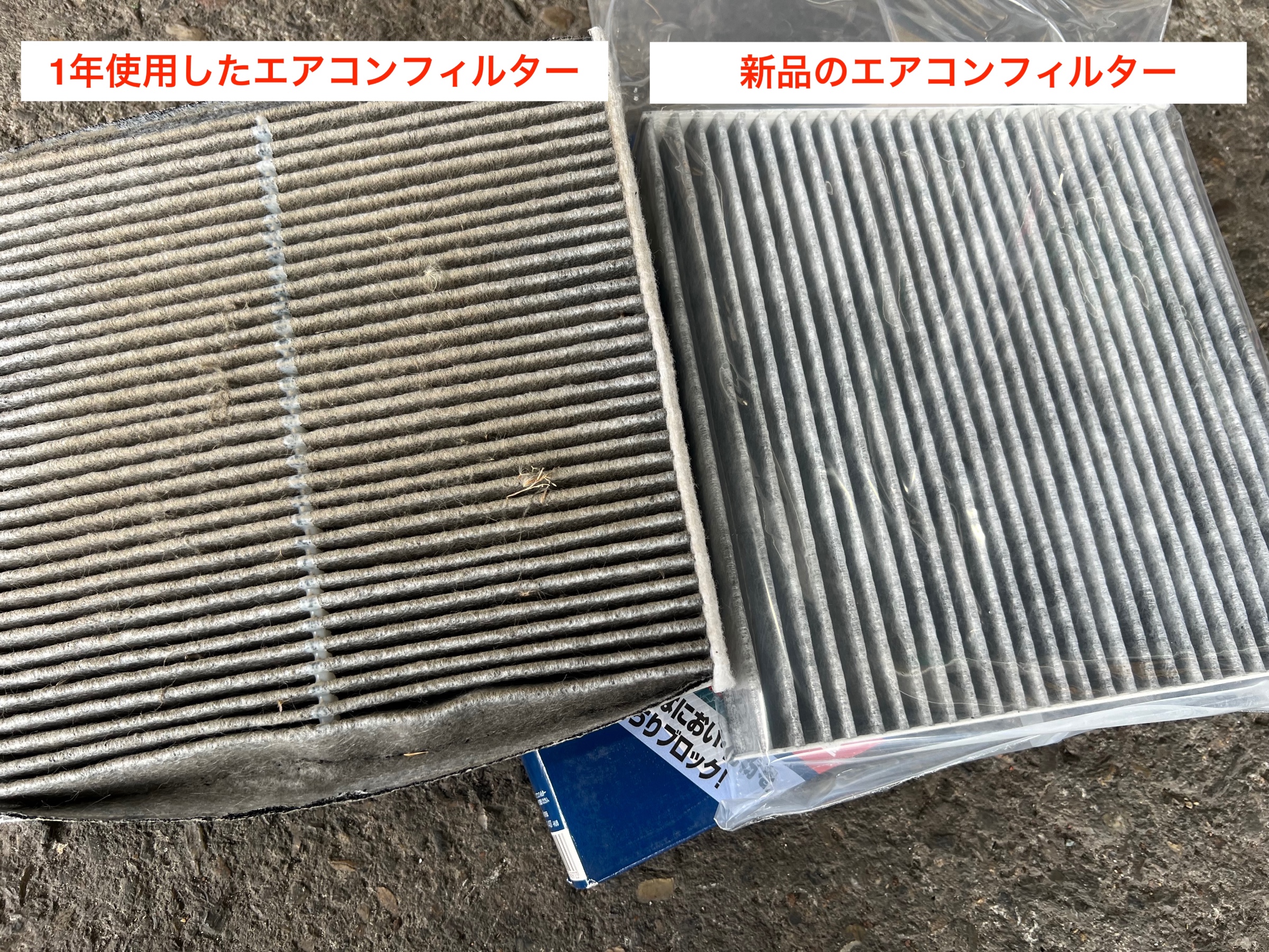 今回は、ホンダ・フィットのエアコンフィルター交換作業をご紹介します。写真は、左が1年間使用したフィルター、右が新品のフィルターです。