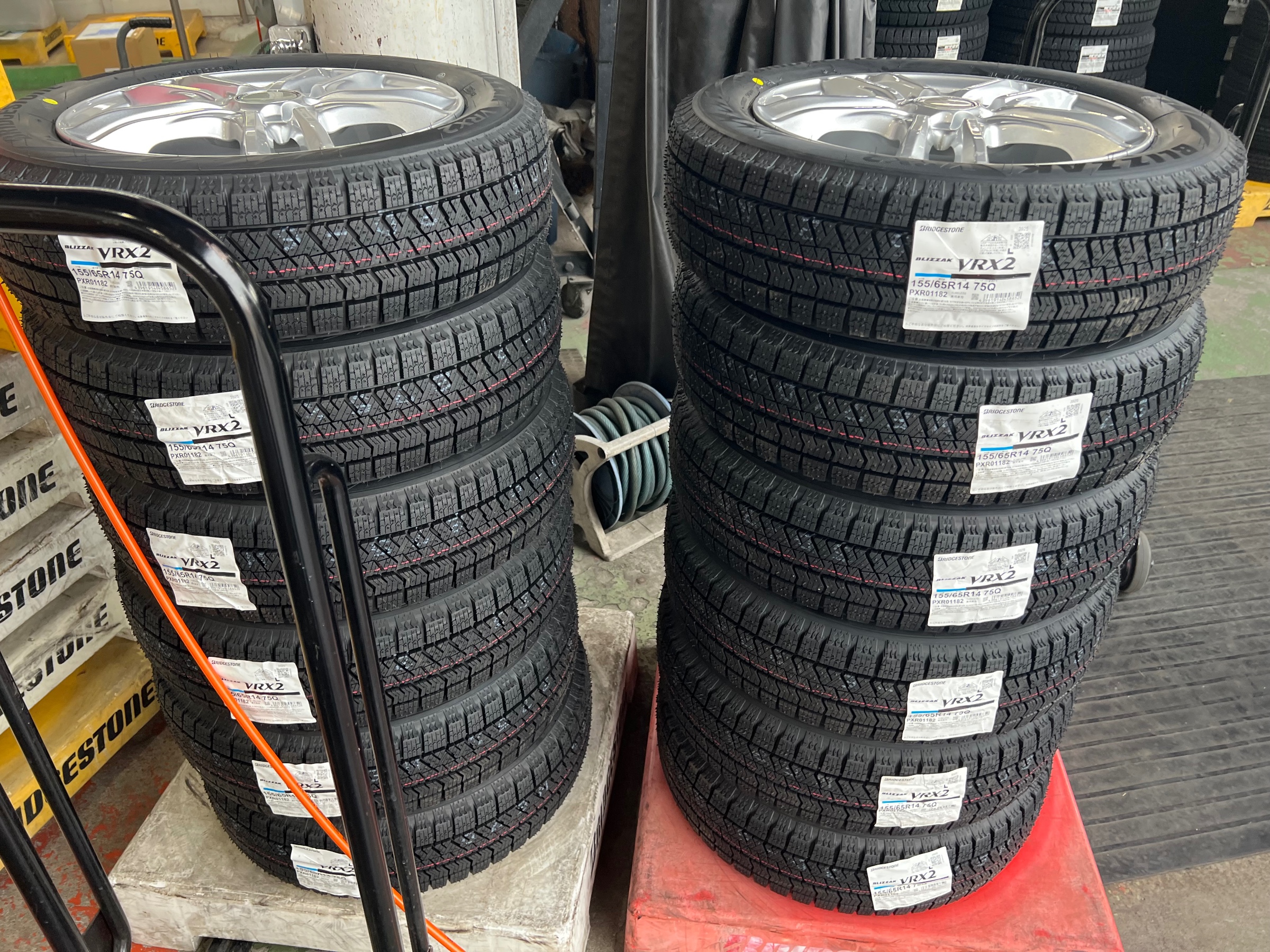 写真は、ブリヂストンの人気モデル「VRX2」のスタッドレスタイヤを組み付けた様子です。軽自動車向けのサイズを中心に、すぐに取り付け可能な状態で在庫を確保しています。