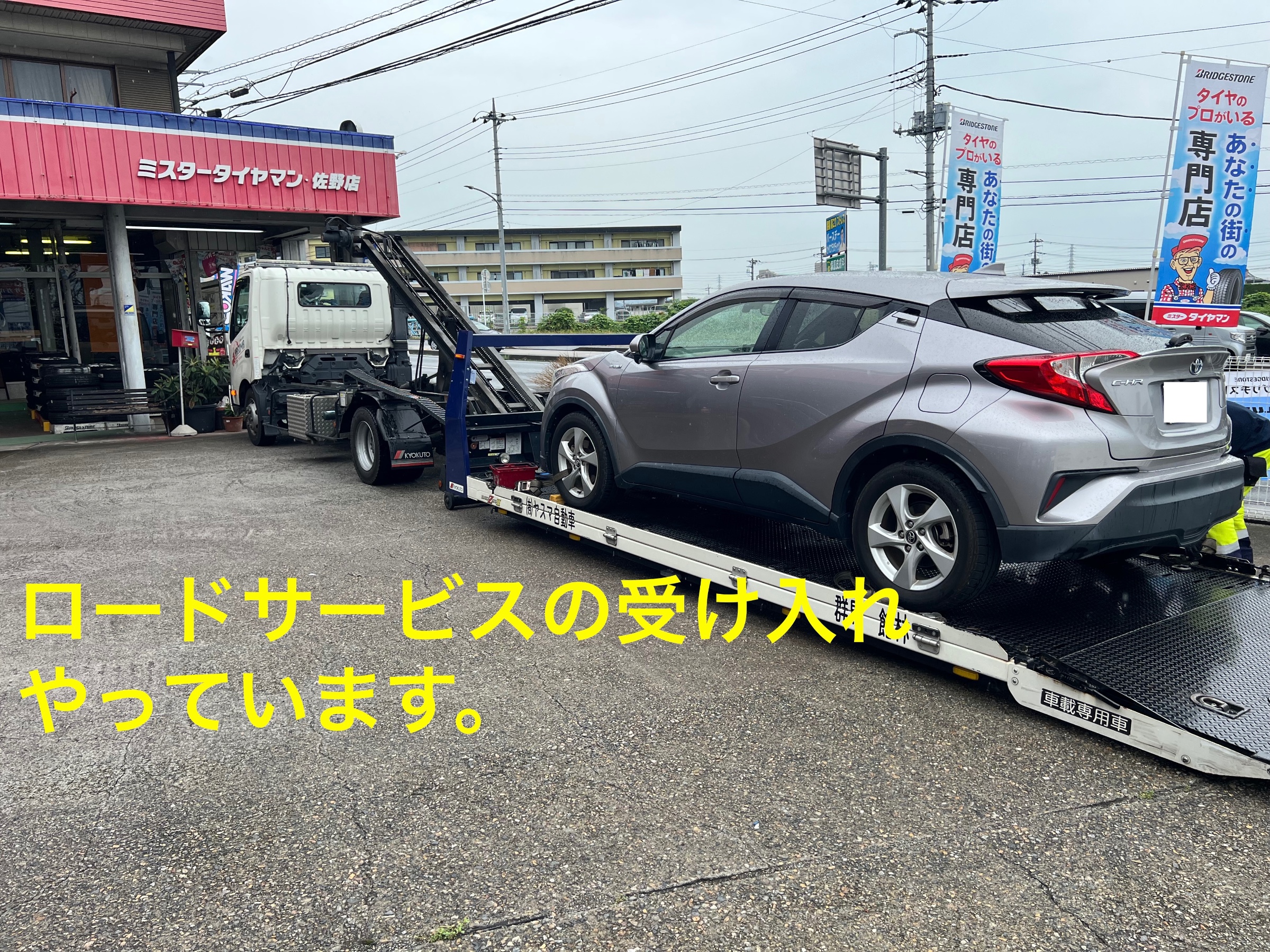 ミスタータイヤマン佐野店では、各種ロードサービスからの搬送車による車両受け入れを随時行っています。