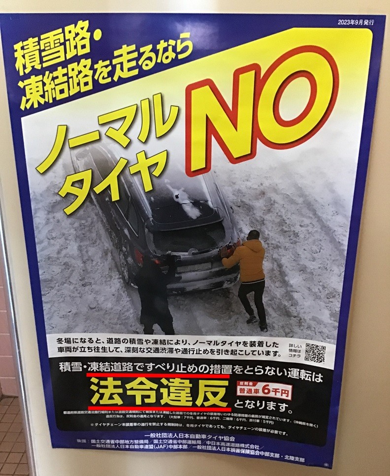 法令で決まっているのにも関わらずノーマルタイヤで超ノロノロ運転で迷惑をかけている。