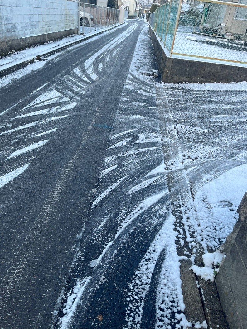 昨日の21時頃から雪が降って朝がガチガチに路面凍結していました。