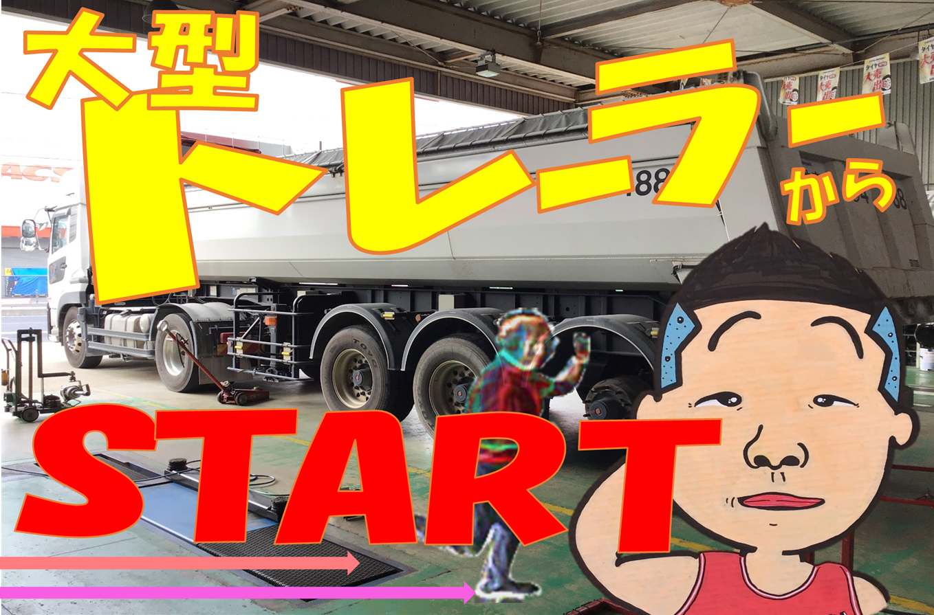 トレーラーの作業内容は、台車の引きずりスーパーシングル385/65R22.5を2本交換&