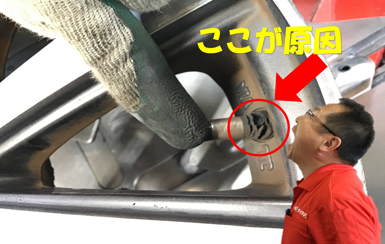 パンクしたタイヤ以外の1本もチューブレスバルブからエアー漏れがあり、