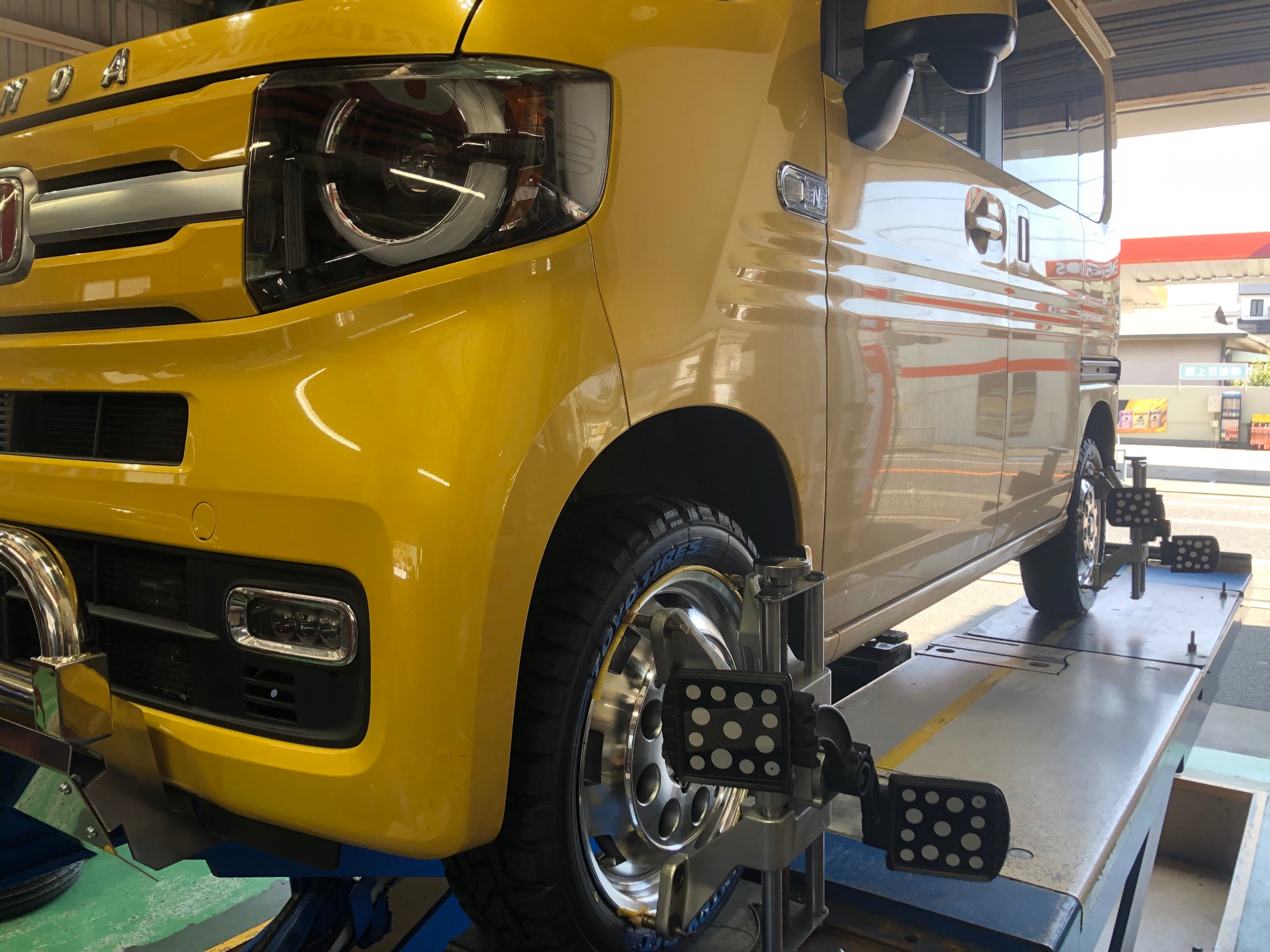 本日の作業は、ホンダN-VANのアライメント調整をしました。リフトアップとホイールを交換されましたのでアライメント調整となりました^_^