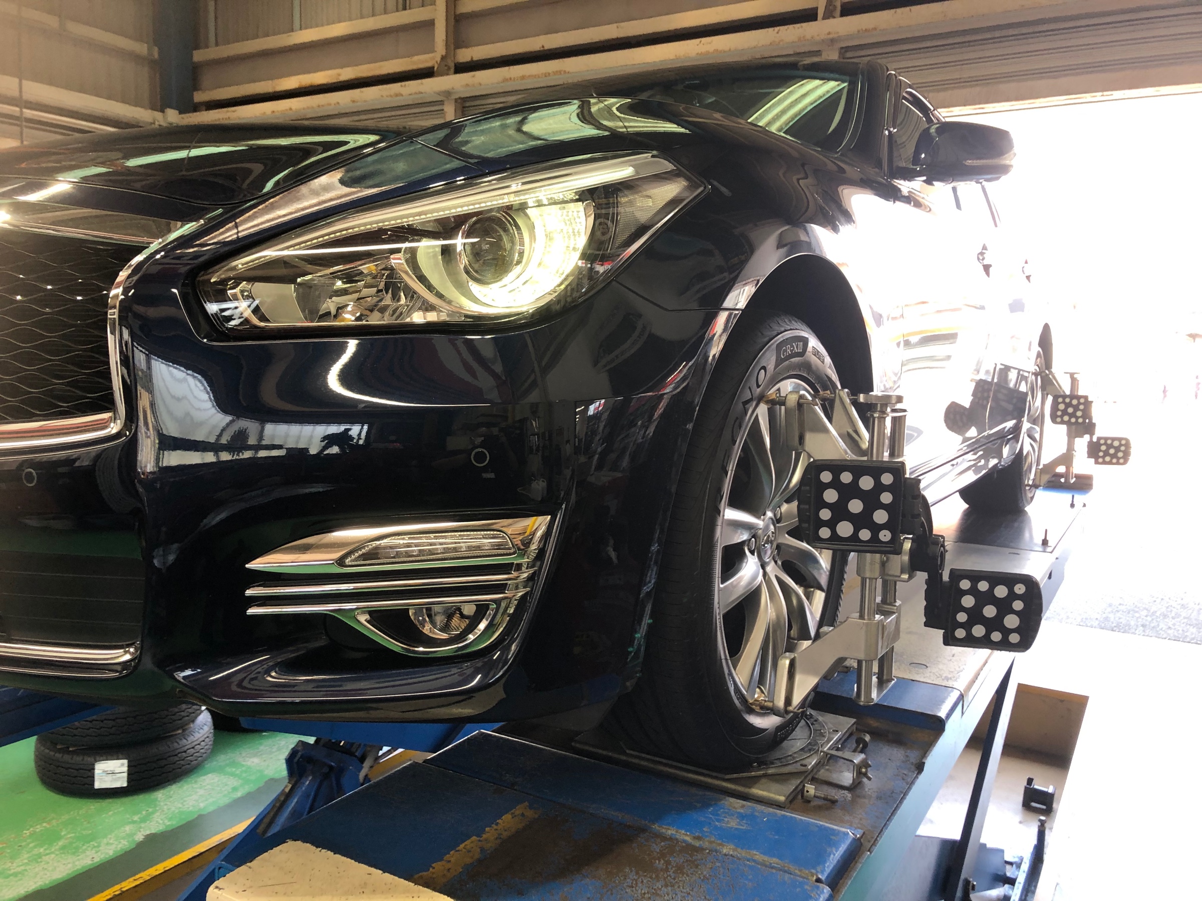 本日の作業は、日産フーガのタイヤ交換&アライメント調整です。タイヤはレグノGR-XⅢ