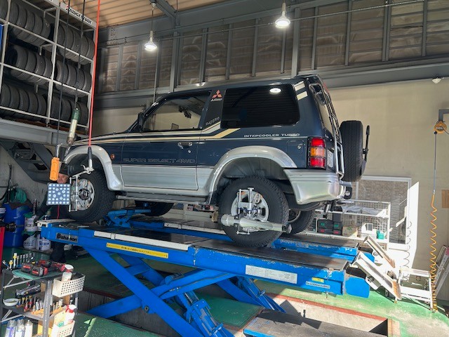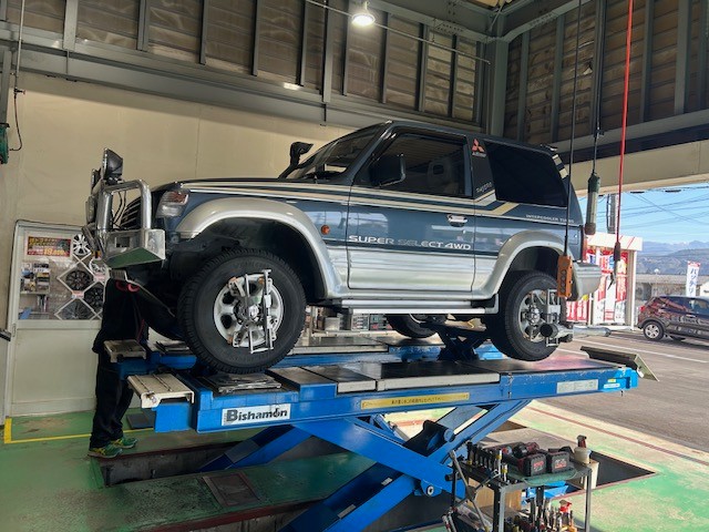 本日は懐かしい車両のアライメント作業をさせていただいております。平成3年式パジェロ、とても35年前のお車とは思えないほどの綺麗な状態でした!