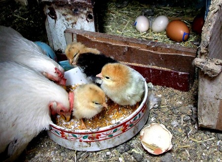 孵化したらヒナを別のダンボール箱に隔離をして、白熱灯を照らしておき、あとはエサと水をあたえておけばかってに大きくなります、残りの卵もしっかり温めてくれるので、孵化率は高まります。
