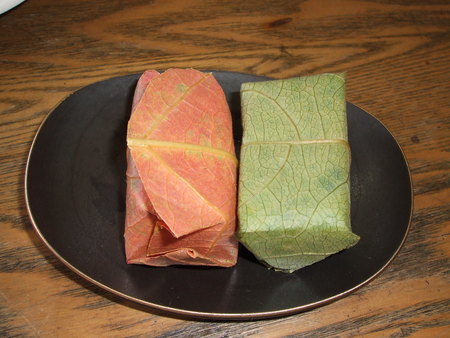 柿の葉で包まれていると思います、どうして青い葉色で保存しているのでしょうかね。