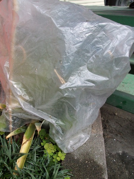 冬の初めに、スーパーの袋を被せて置いたのですが、はたして枯れずに、生きているか