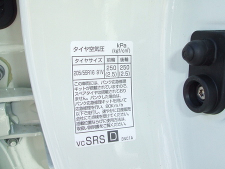 ドアーを開けて指定空気圧をみると2.5ヘクトパスカルで、高めに設定してあり、エコタイヤのエコピア のセッティングで転がり抵抗の軽減を図っており、この空気圧では乗り心地が少し悪いかもしれない。