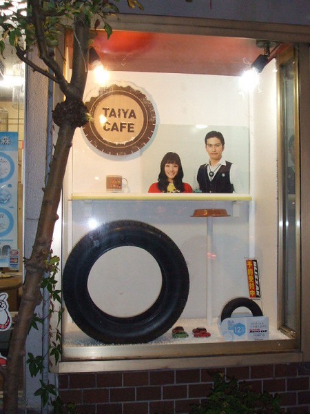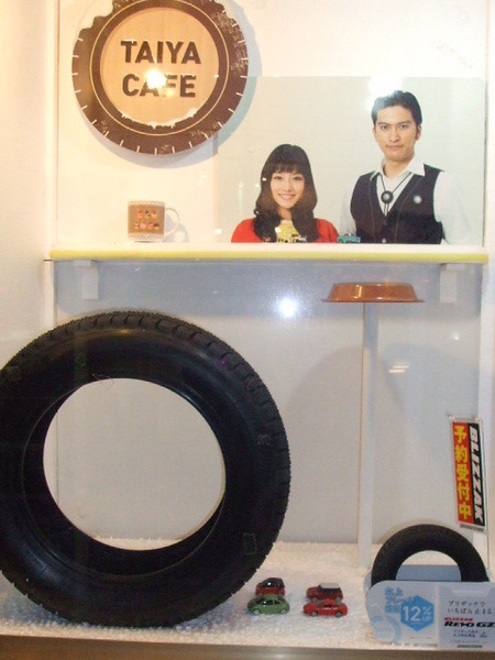 当店も早速取り入れまして、出窓にタイヤカフェの模擬店をイメージして、作ってみました。