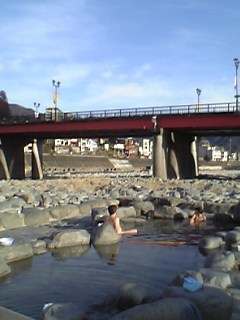 旅館で履いてきた下駄の音を忍ばせながら、露天掘りの湯船に近づいていくと、お風呂上りの年配の女性が、ほてった体を川の夜風で冷やしていたので、声をかけて見ました。