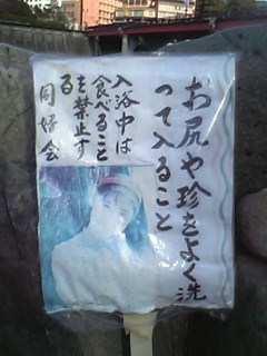 橋の上から丸見えで、そのために裸で入浴すると「公然わいせつ陳列罪」で捕まるので、何らかの布キレを身に巻いていればOKだそうです。そりゃかの芸能人はさぞかし立派な宝物を、お持ちでしょうが、おれ達おとうさんには無縁なのに、無粋な規制です。