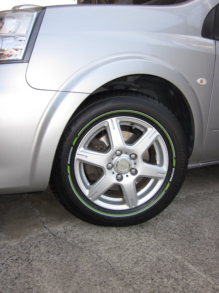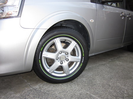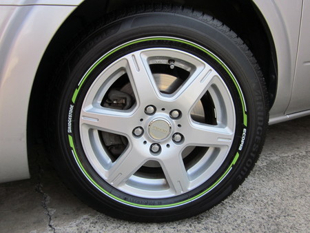 カラータイヤが入荷するまで、とりあえず展示タイヤでアルミホイールを組み付けて