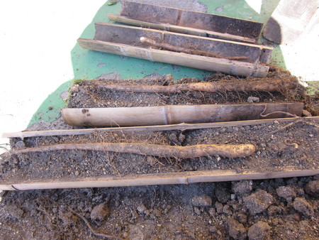去年にムカゴを竹筒に撒いて、山芋作りに挑戦したのですが、竹を割って中身を取り出してみたら、大きいので長さが40㎝ほどで、竹筒にムカゴの実が2個入っていて、大きくなった山芋は成長が半分ぐらいしかなく、やはり栄養が足らないのと、竹筒の中が窮屈なため、成長しなかったと思われます。