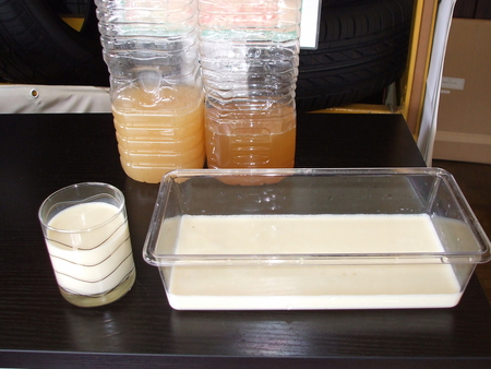 写真の左側がトギ汁に黒砂糖と塩を加えた容器で真ん中が一週間ぐらいたったトギ汁です。