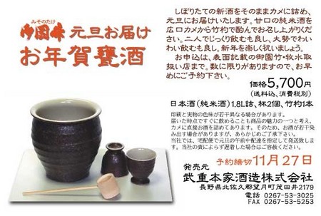 そこで武重酒造さんが、考えたのが「お年賀甕酒」で搾りたての日本酒を元旦に甕に入れ宅配で送るというアイデアで売り出したところ、大ヒットし数千鉢の「お年賀甕酒」が毎年売れているそうです。