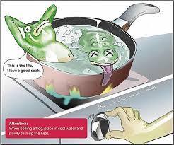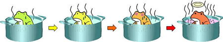 冷たい水の中にカエルを入れて、少しづつ温めていくと、カエルはそれが