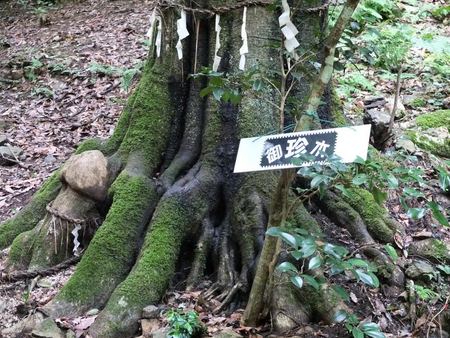 琴滝の傍らに、大きな杉の根元に「御珍木」と書かれた札が立っていたので、何だろうと思って根元に近づくと、それは見事な御珍木がそそり立っていました。
