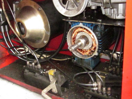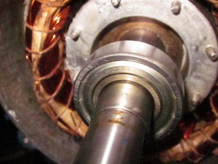 ベルトを外したままモーターを空転すると、ギュー」という軋み音が鳴りだしたのです、モーター本体なのか、ベアリングなのかどちらかですが、ともかく、プーリー側のモーターケースを取り外して片側のベアリングを回してみてもガタ付きもなく、コイルの焼き付きも見られませんでした。