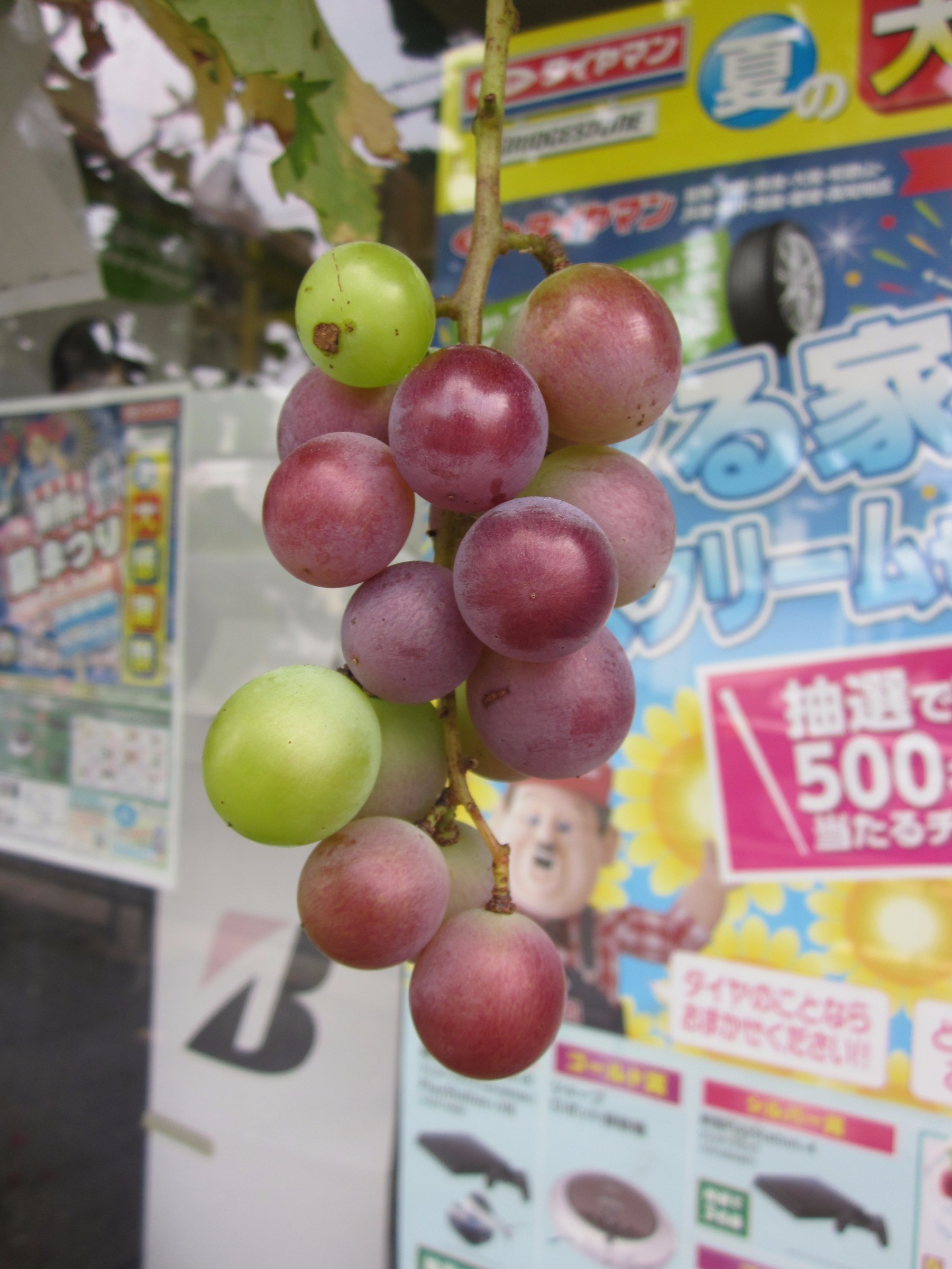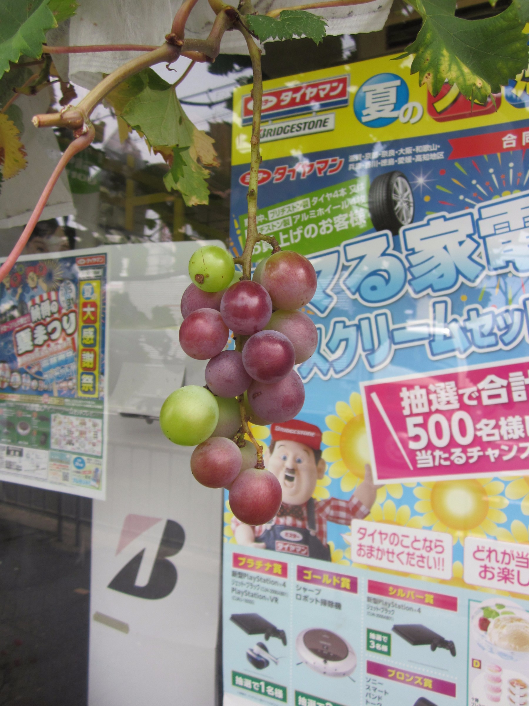 おれ達お父さんの店「ミスタータイヤマン高槻」に植えてあるブドウがようやく色づいてきました。