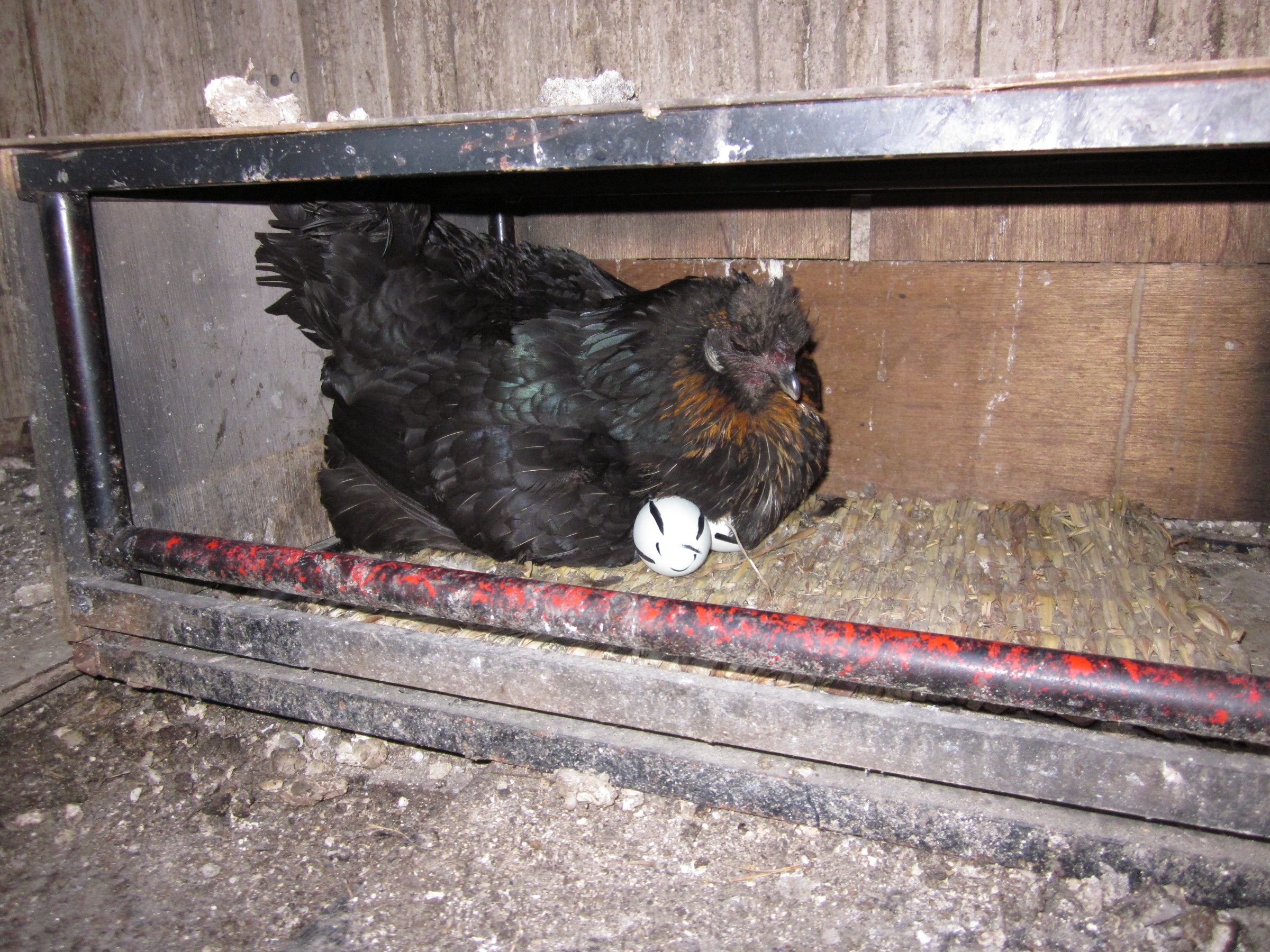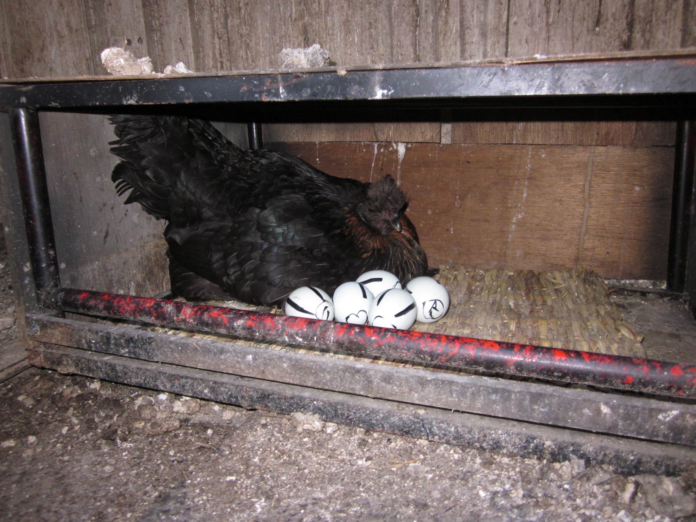 マジックで印をつけて、ニワトリの前に置いておくと、嘴で羽の下に入れて抱き始めたのです。