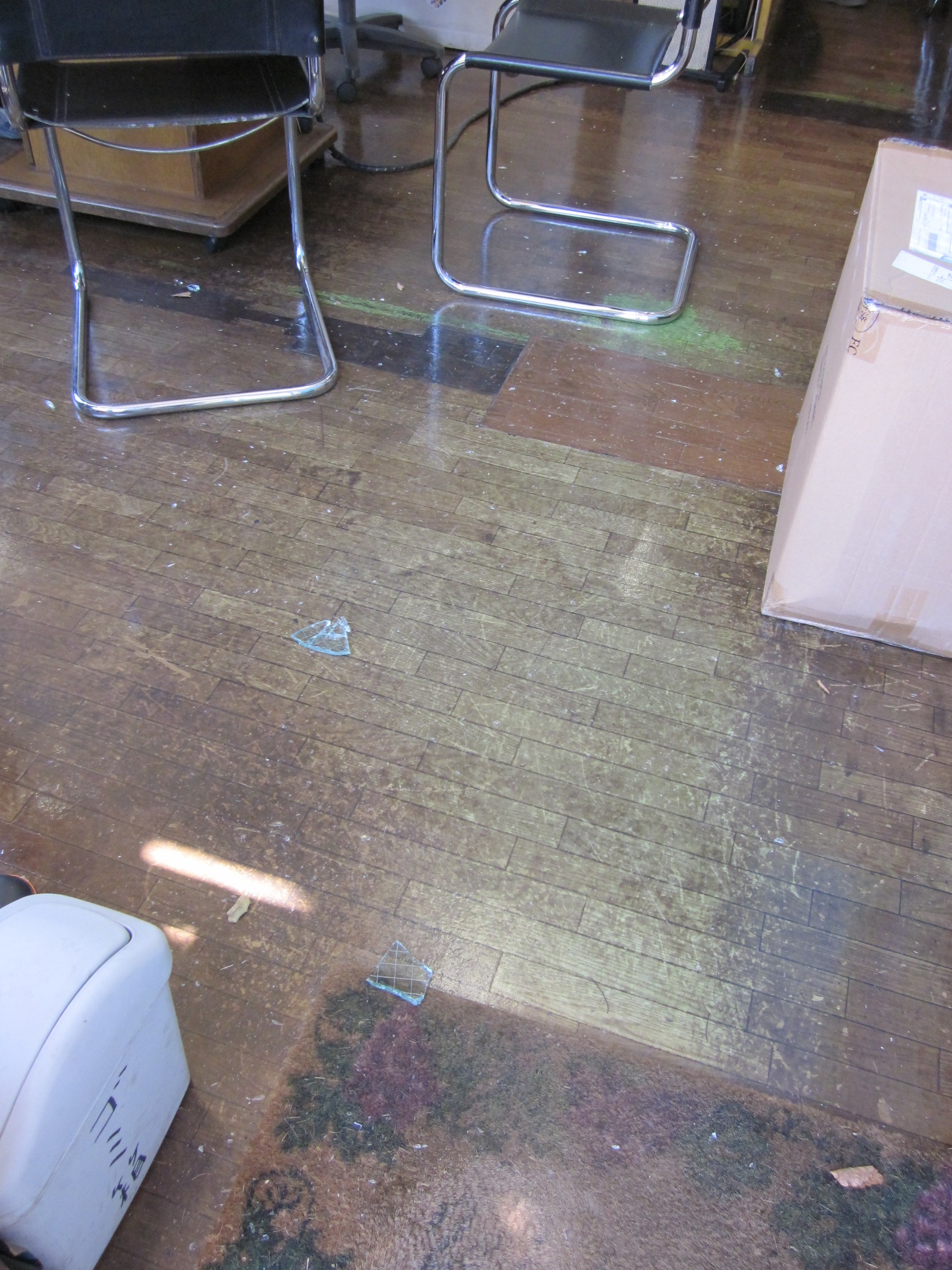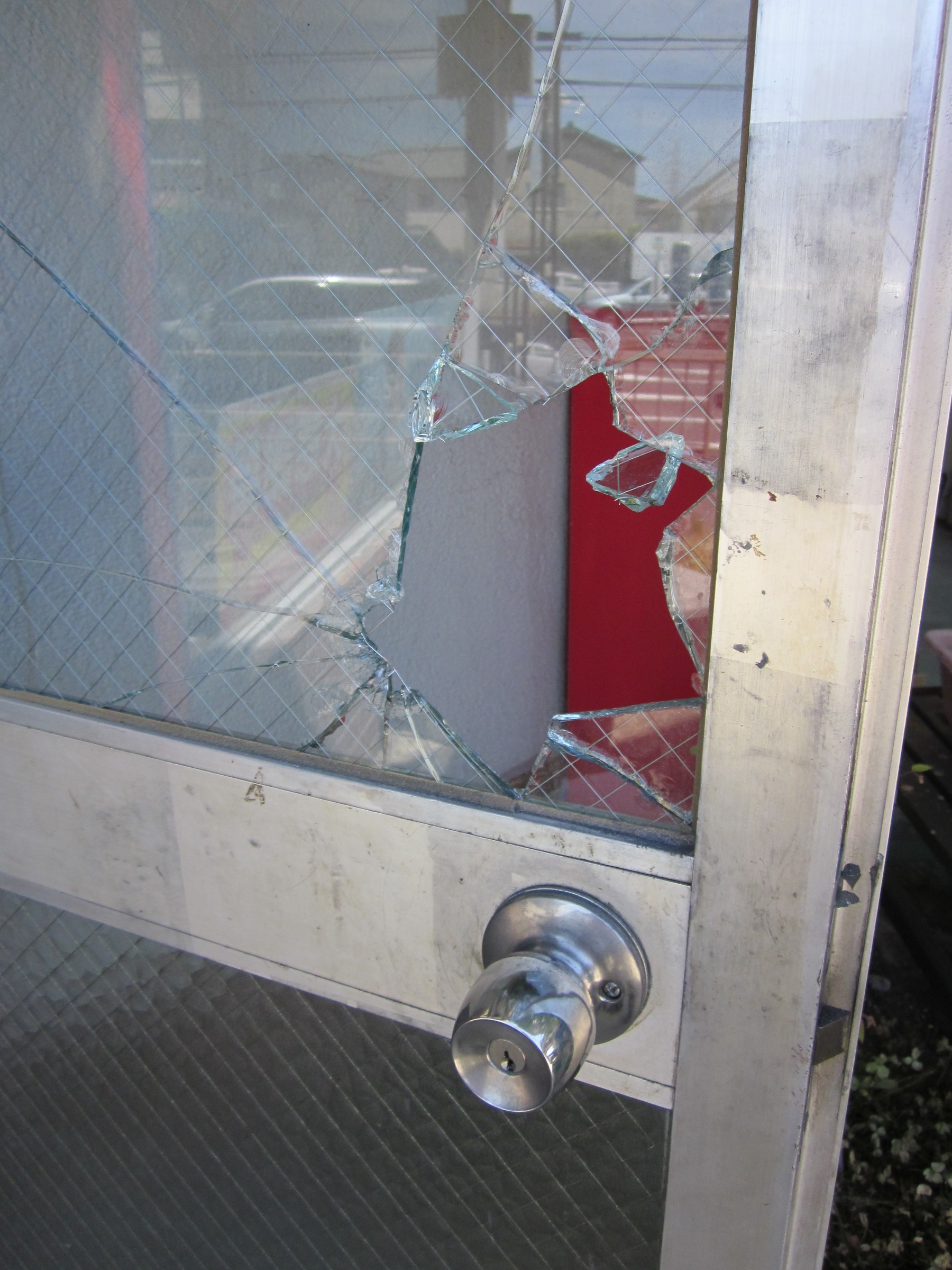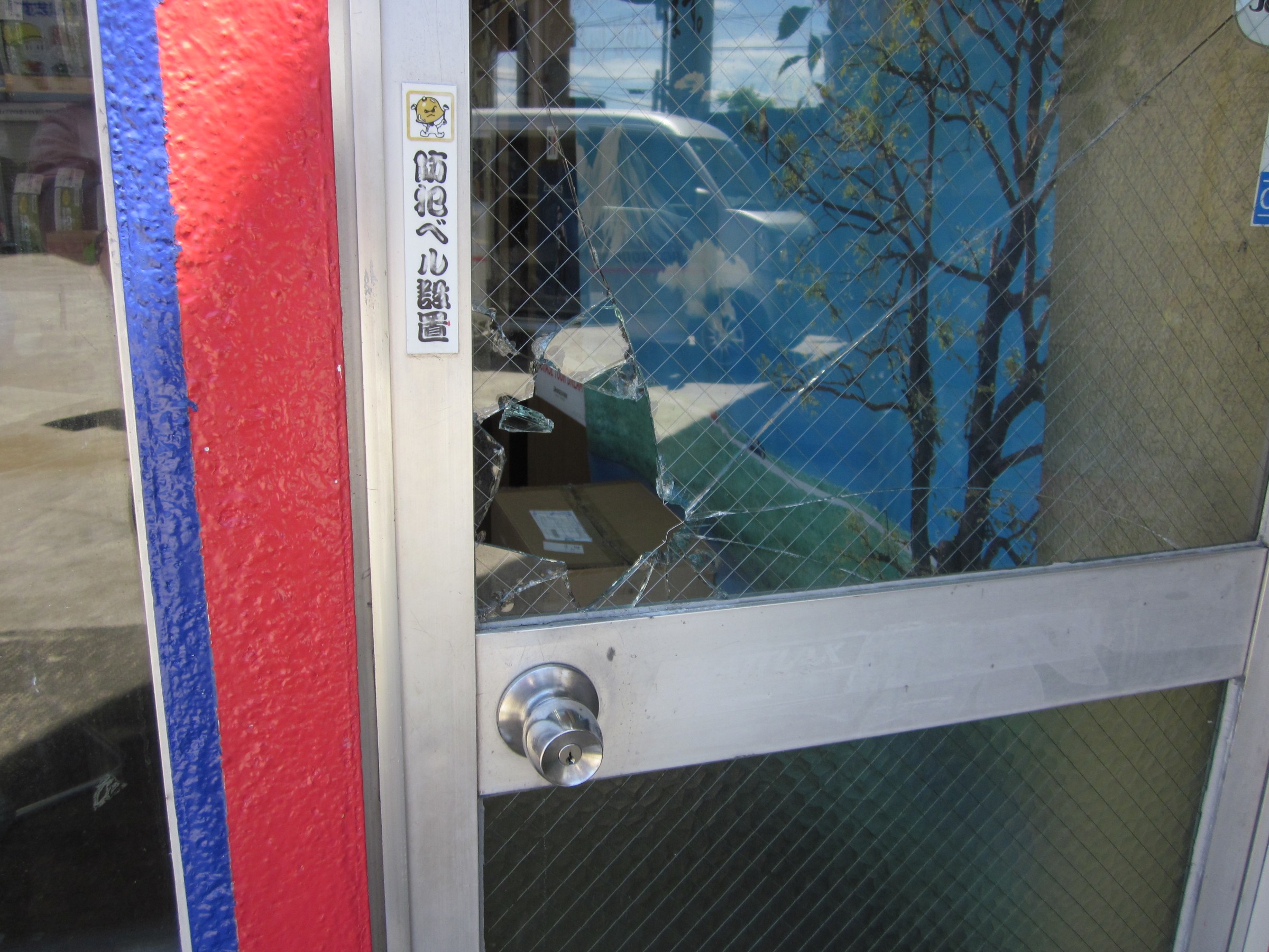 入口のドアーのガラスが破られていたのです。