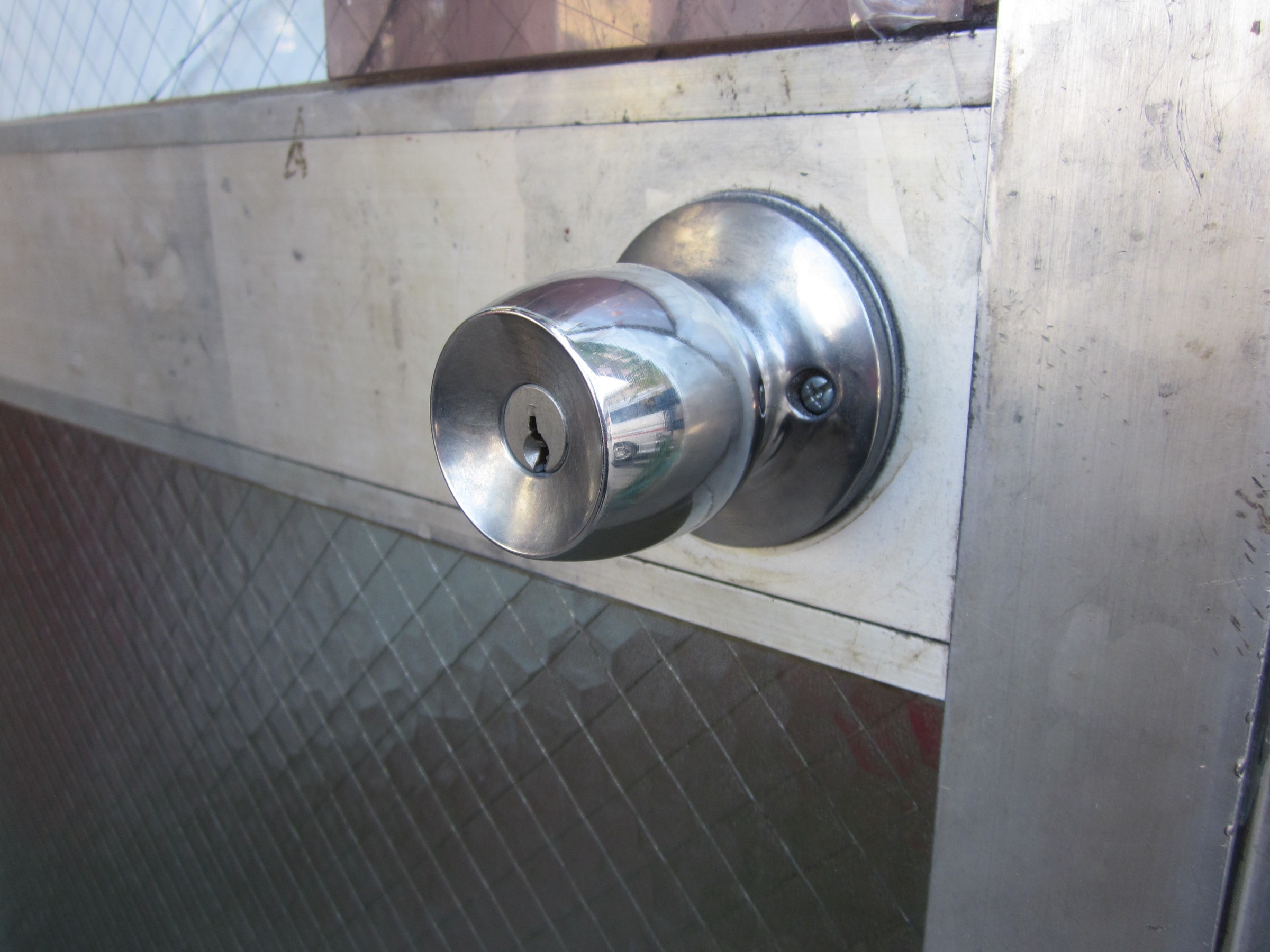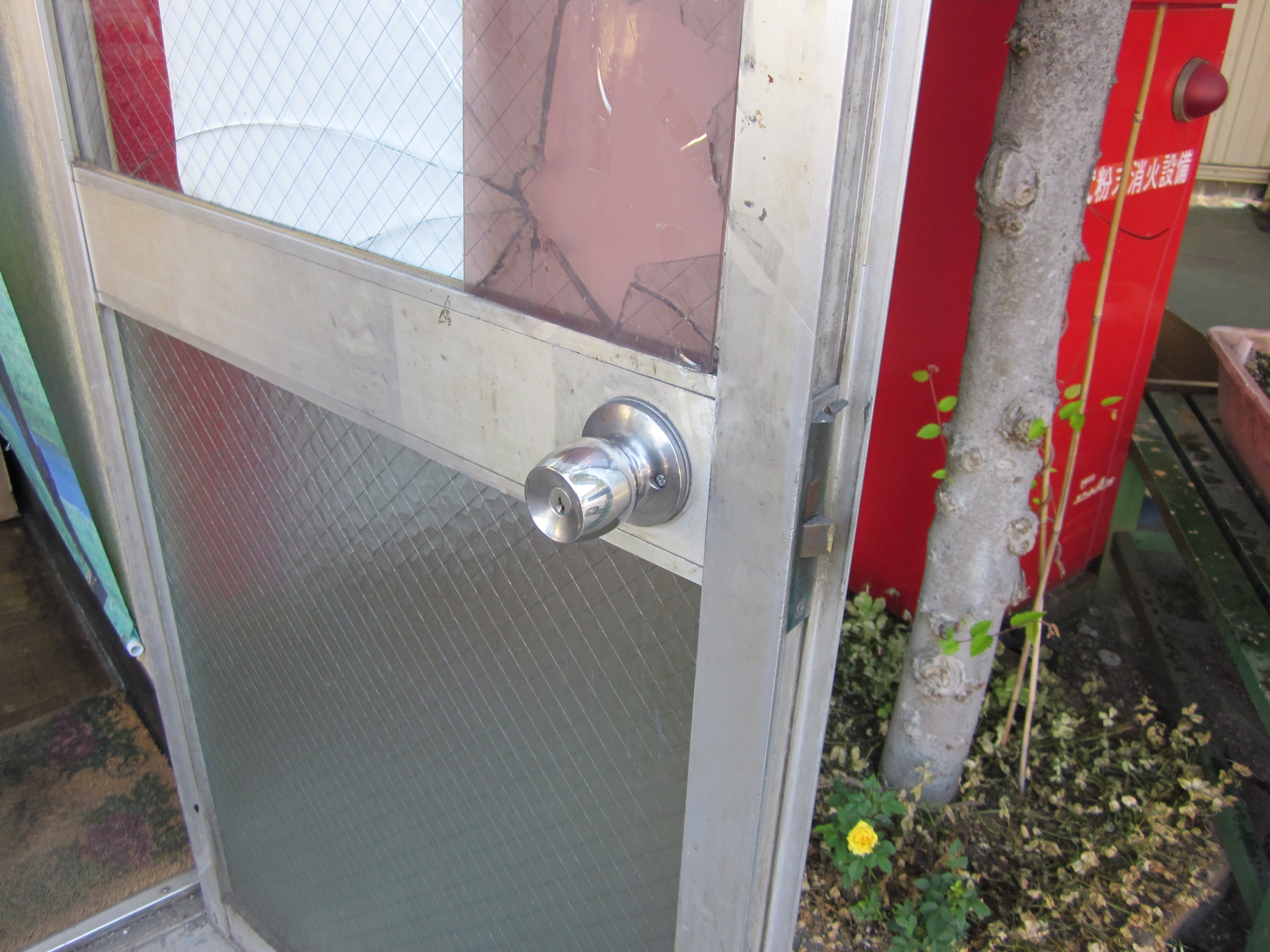 入口のドアーはステンレスネット入り強化ガラスで厚みが6mmあったのですが、腕が入るぐらいの