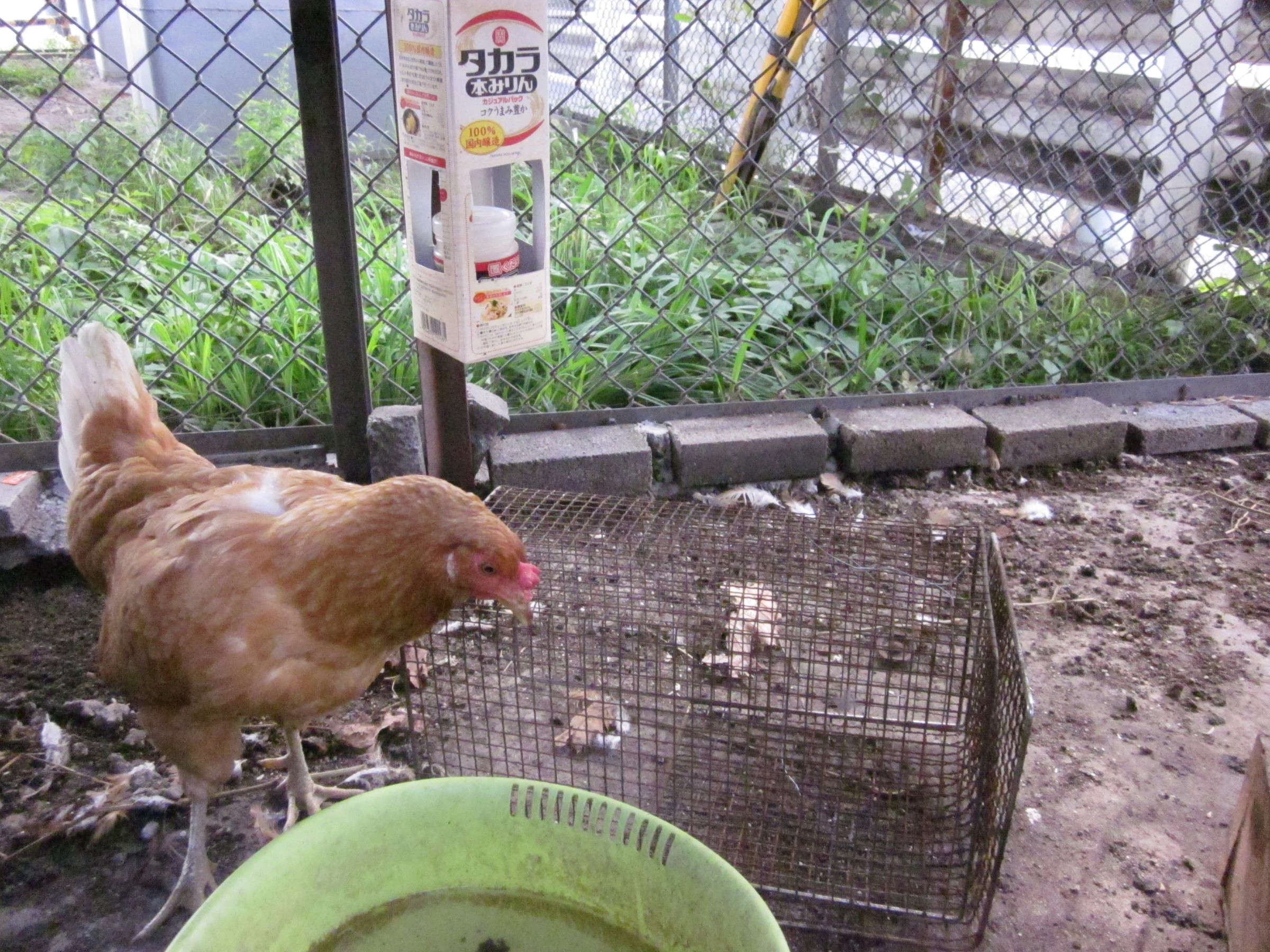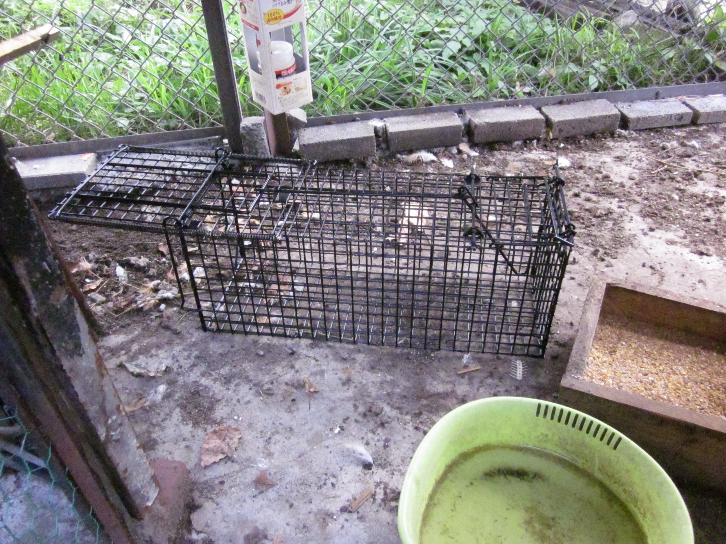 捕獲するために、捕獲器をネットで購入し、警戒心をとくために暫く疑似捕獲器で餌のニワトリの