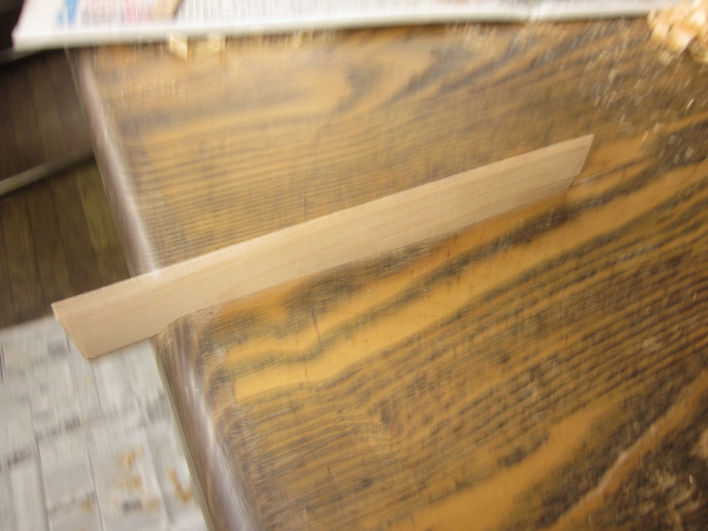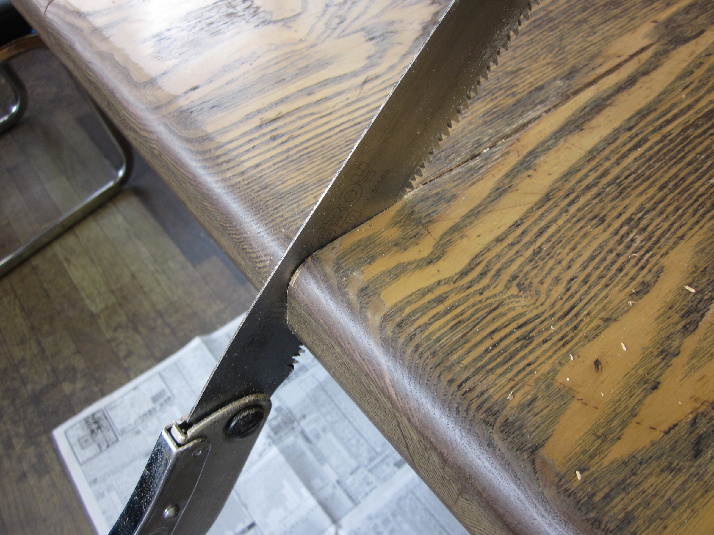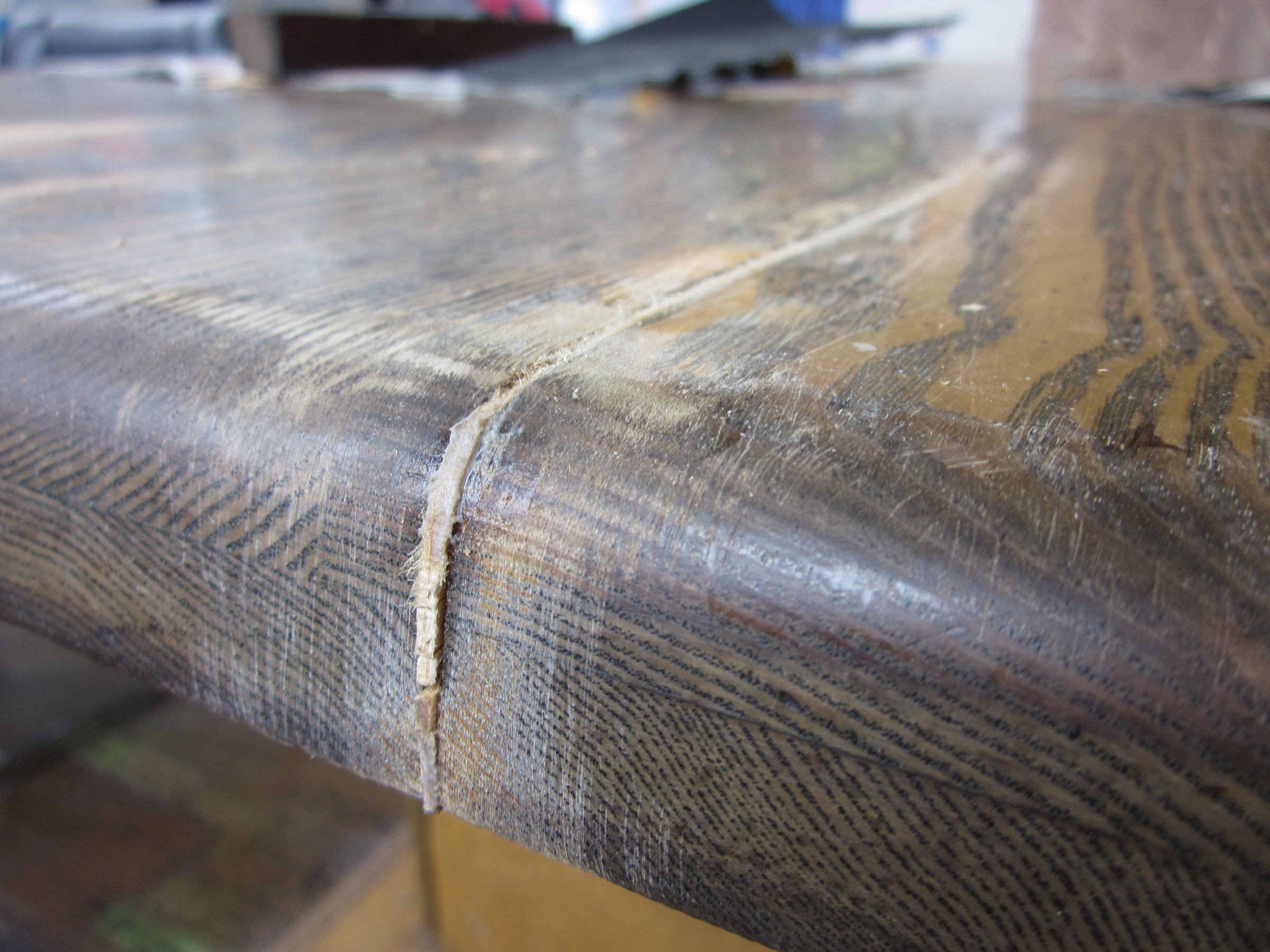 ひび割れの補修ですが、ノコギリでひび割れを幅広く切っていきその隙間にうすい板を差し込んだのです
