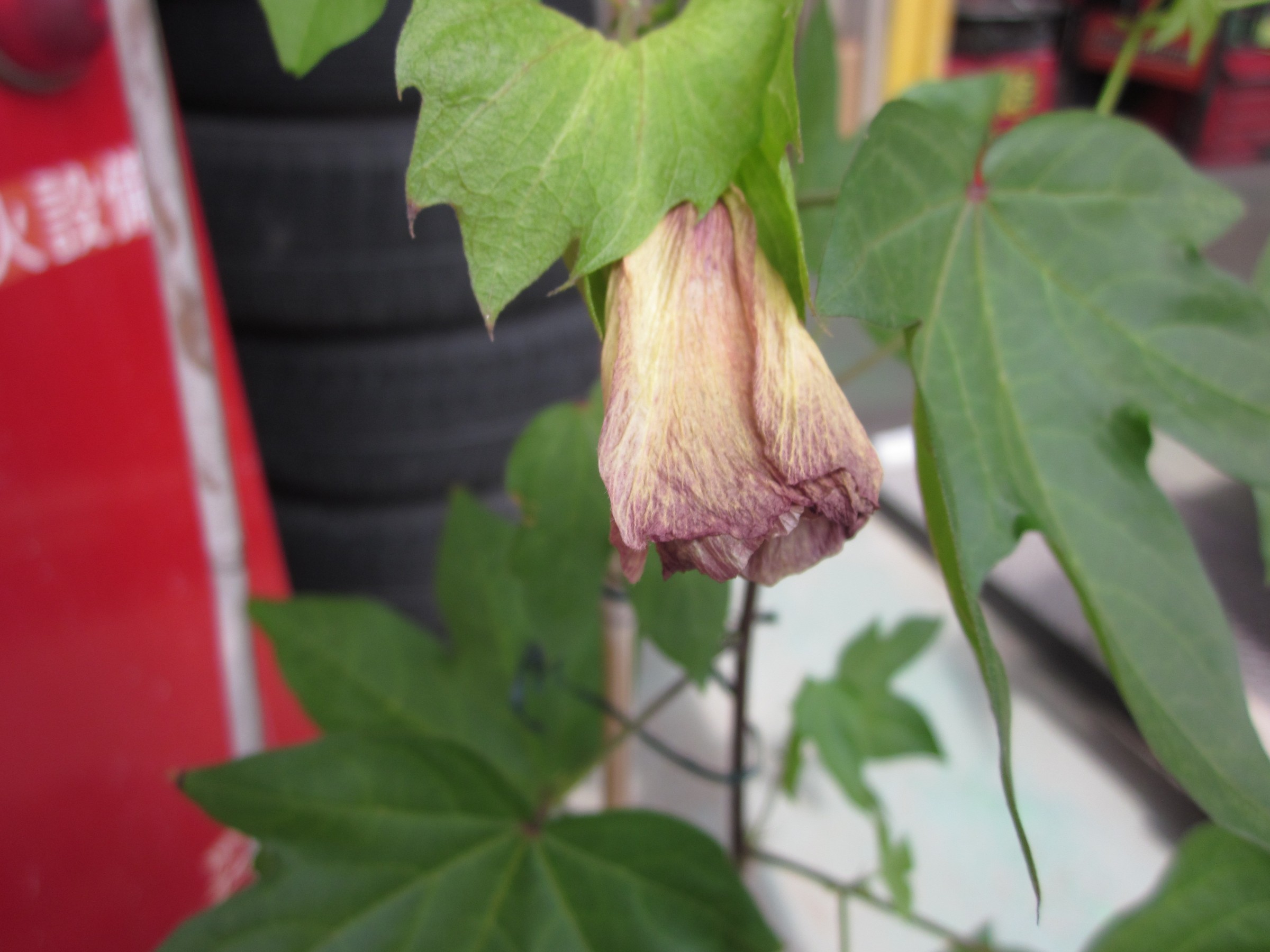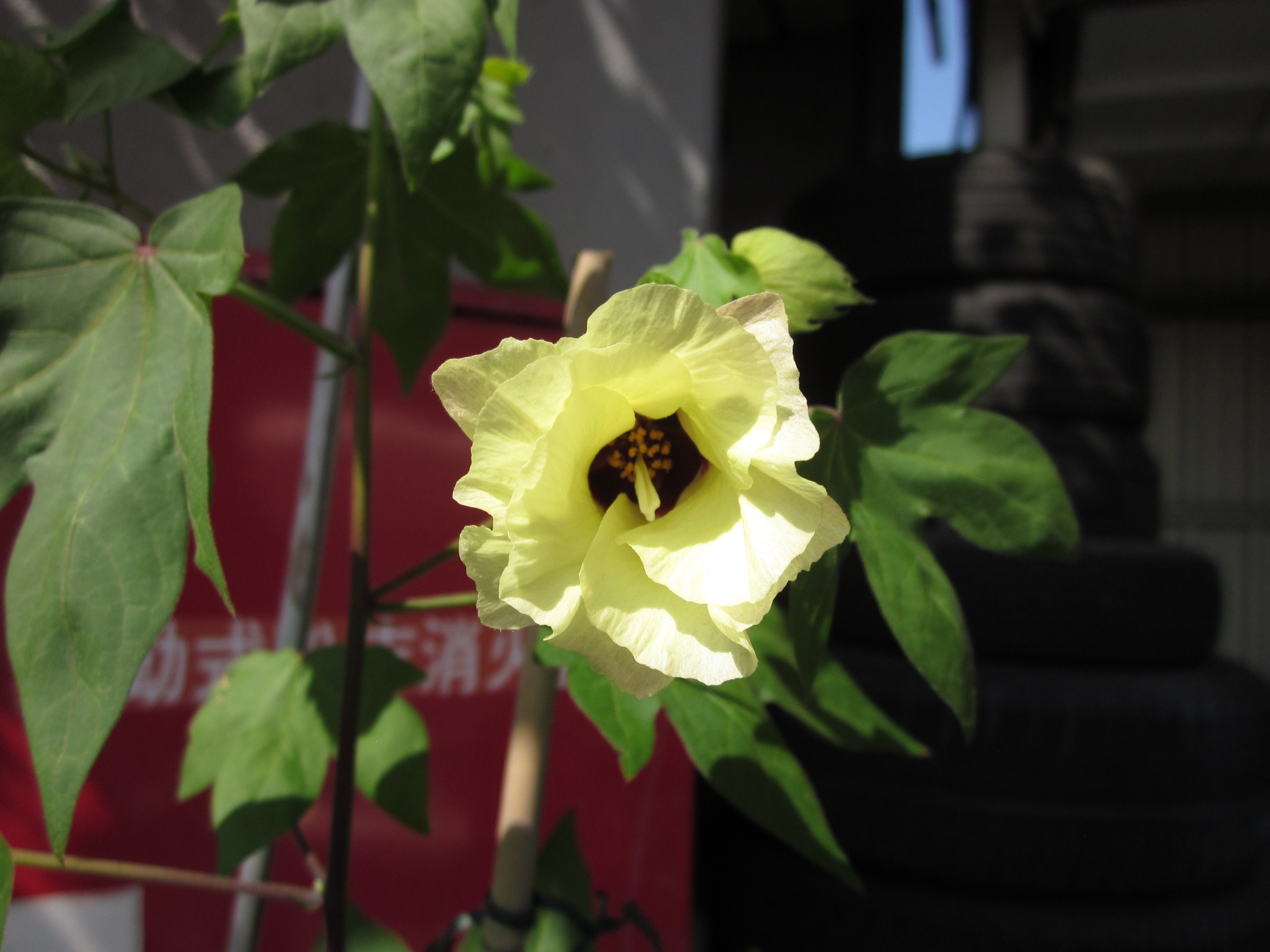 おれ達お父さんの店「ミスタータイヤマン高槻」で鉢植え栽培している綿の花が咲きました。