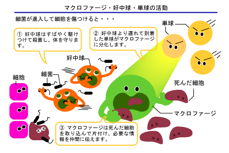 「マクロファージ」は白血球の一種で体内に生じた変性物質や侵入した細菌などの異物を捕食して消化し、清掃屋の役割を果たす。とくに、外傷や炎症の際に活発である、このマクロファージが生成される条件は一酸化窒素が体内で科学反応により出来て血管が柔らかく且つ太くなり多くのマクロファージが生成されるのですが、何かの理由で一酸化窒素の科学反応がされなくなりマクロファージが少なくなり免疫力が低下する原因です。