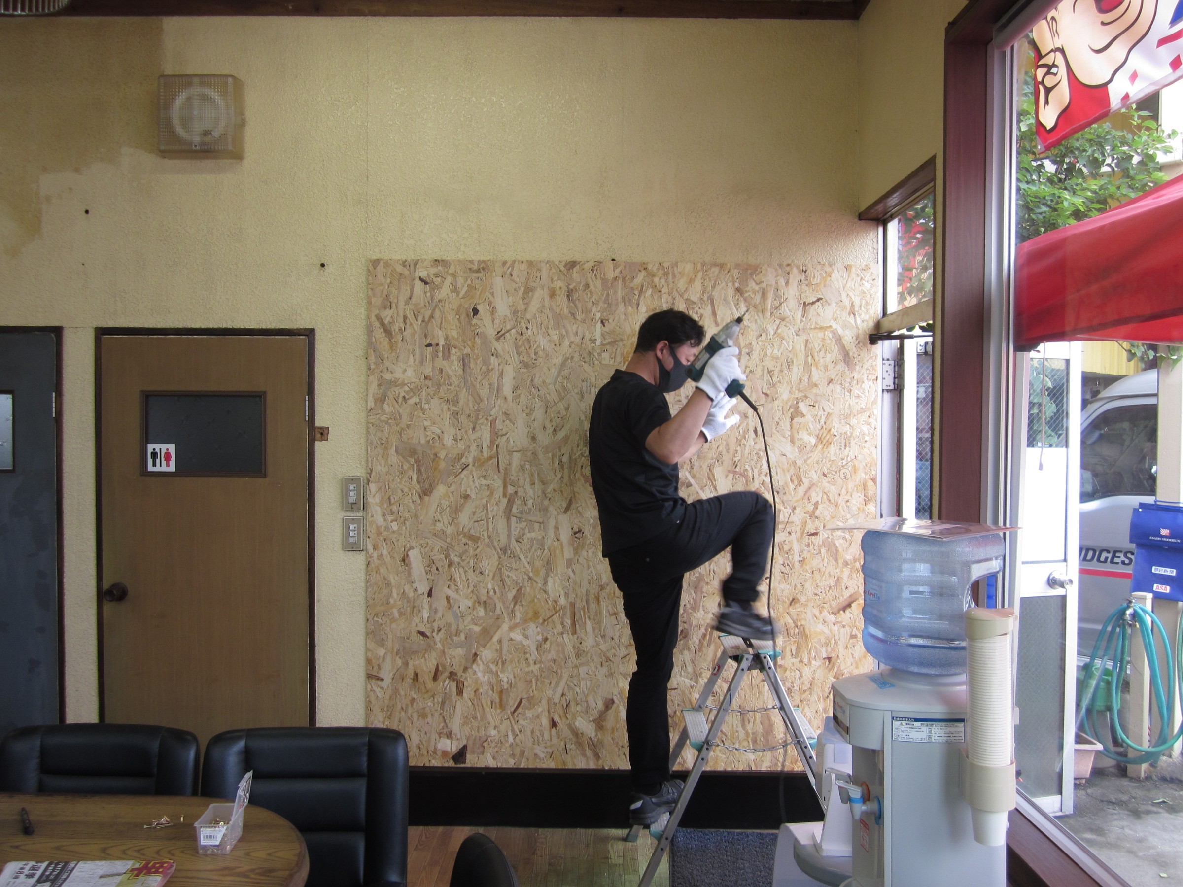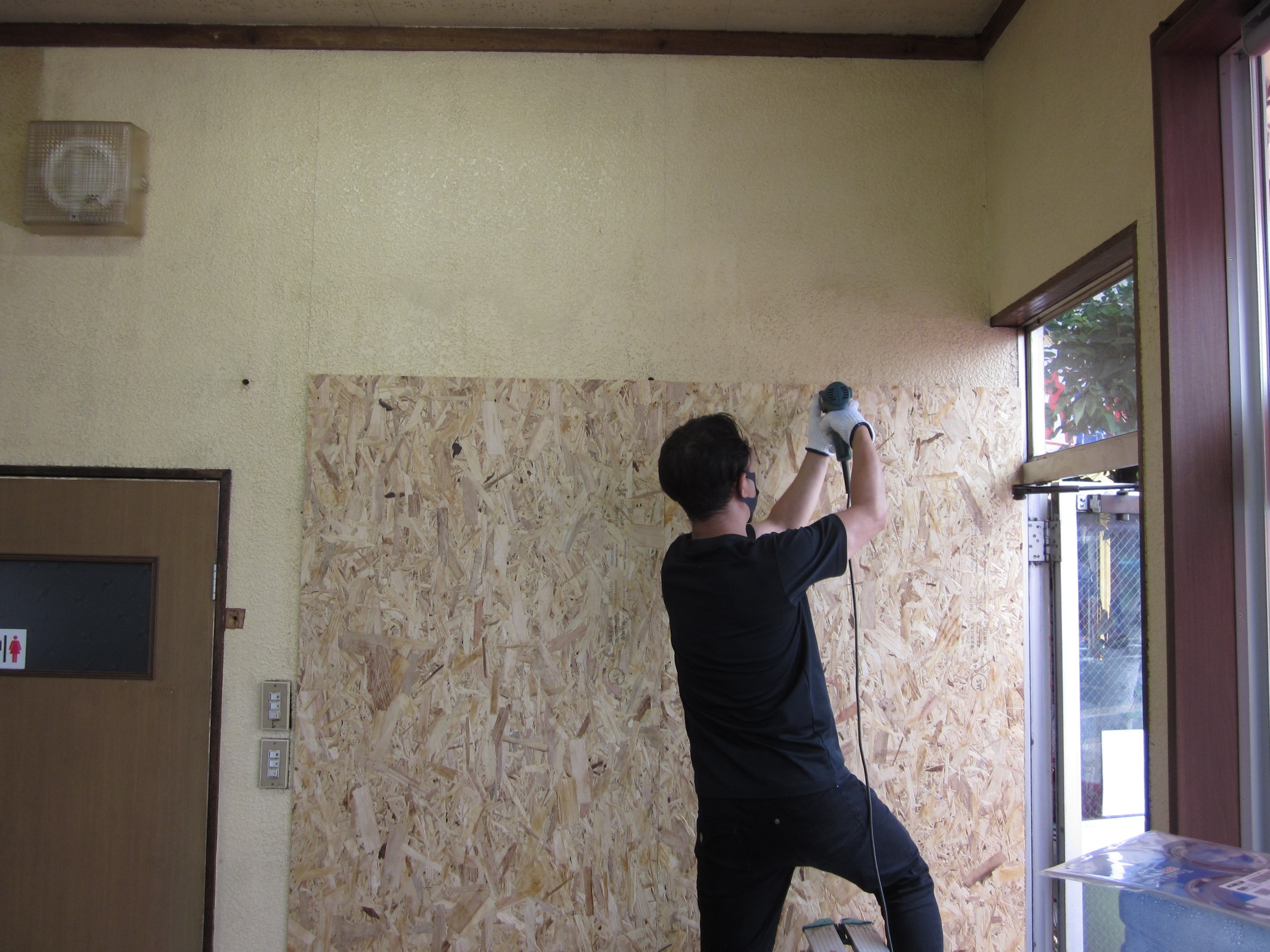 壁をOSBボードに張替え、店内の雰囲気を従来のイメージと変わった雰囲気を醸し出すよう