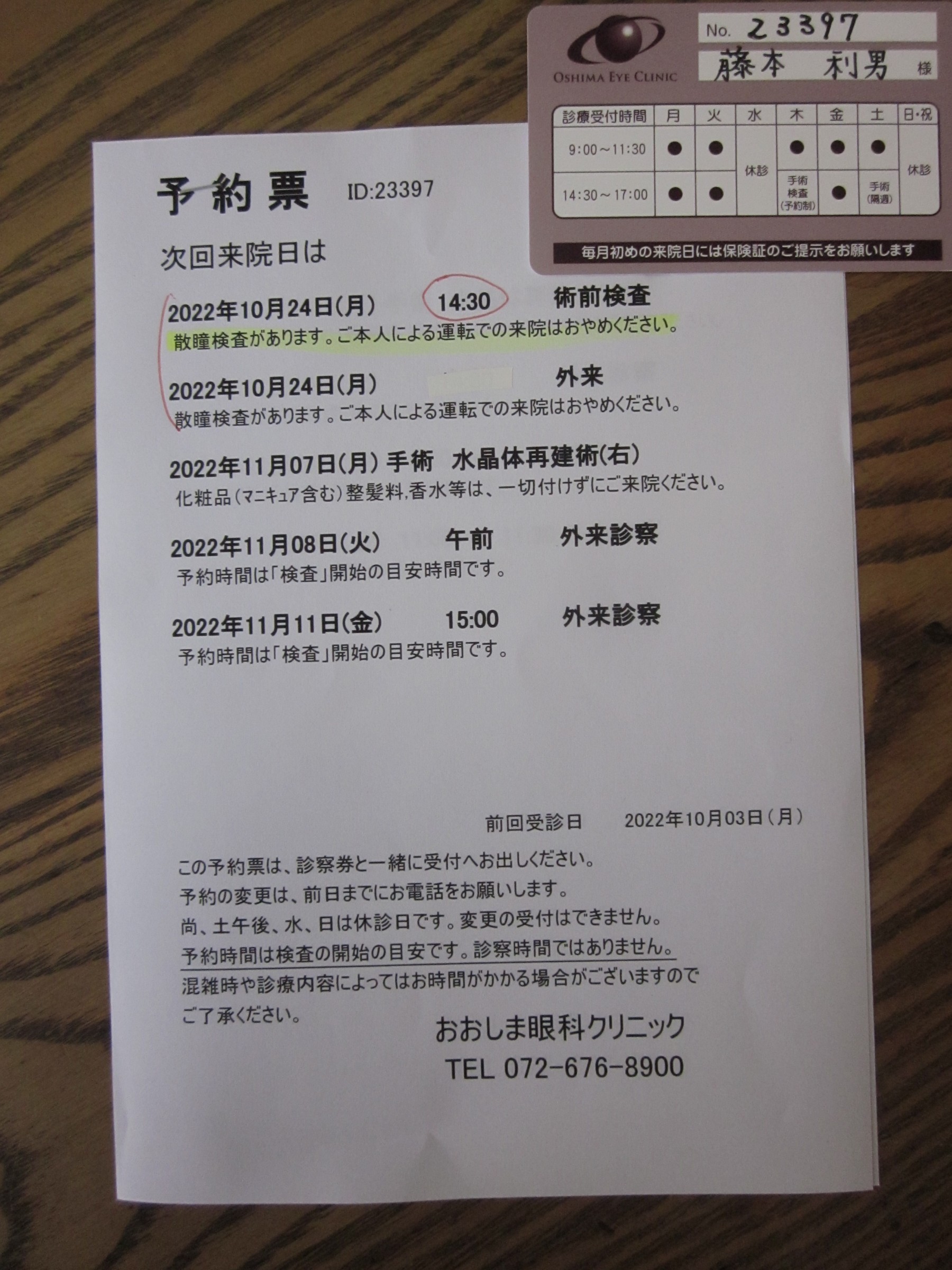 この間、10分ほどのやり取りです、後は看護師さんと手術の日程の打ち合わせをしたのですが、手術を受ける患者さんの予約で一杯で、空いている日は11月14、11月2日で2回に分けて両目を手術の予約を取りました。